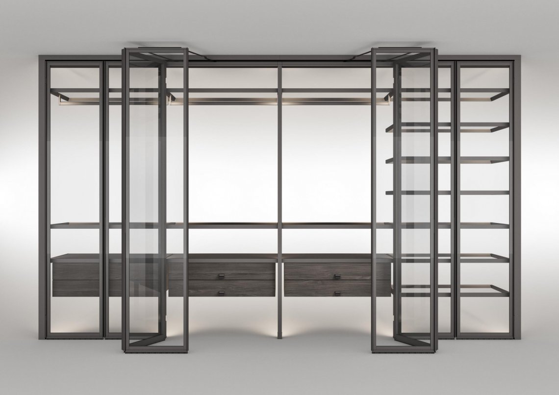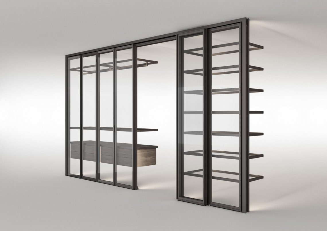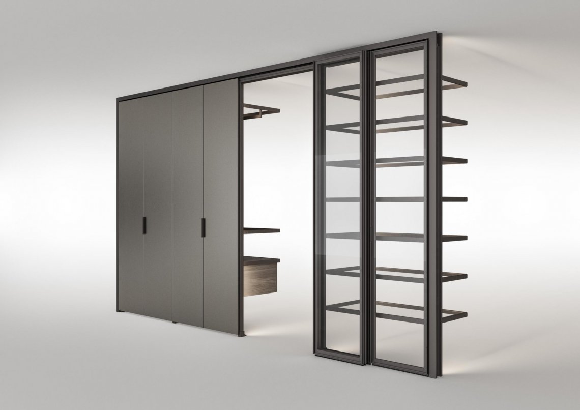 The evolution of Palo Alto I-Box, Palo Alto Free is the new wardrobe concept that calls for the use of doors directly supported by floor-to-ceiling posts that form the structure. This simple system for closing niches or separating spaces sustains a series of accessories for the compartments, similar to those of the Palo Alto I-box.