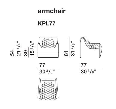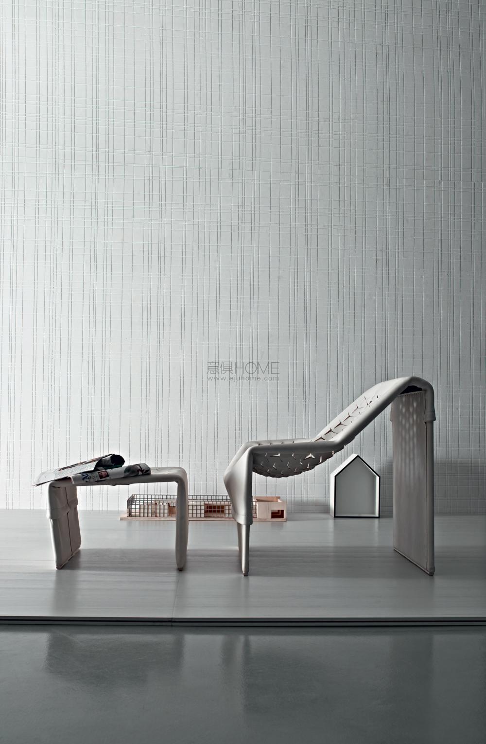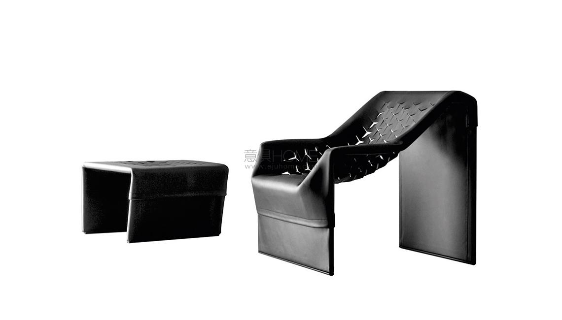 Armchair and pouf with self supporting hide leather cover with a special pattern.