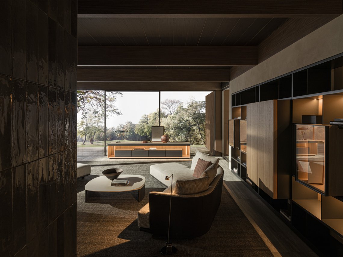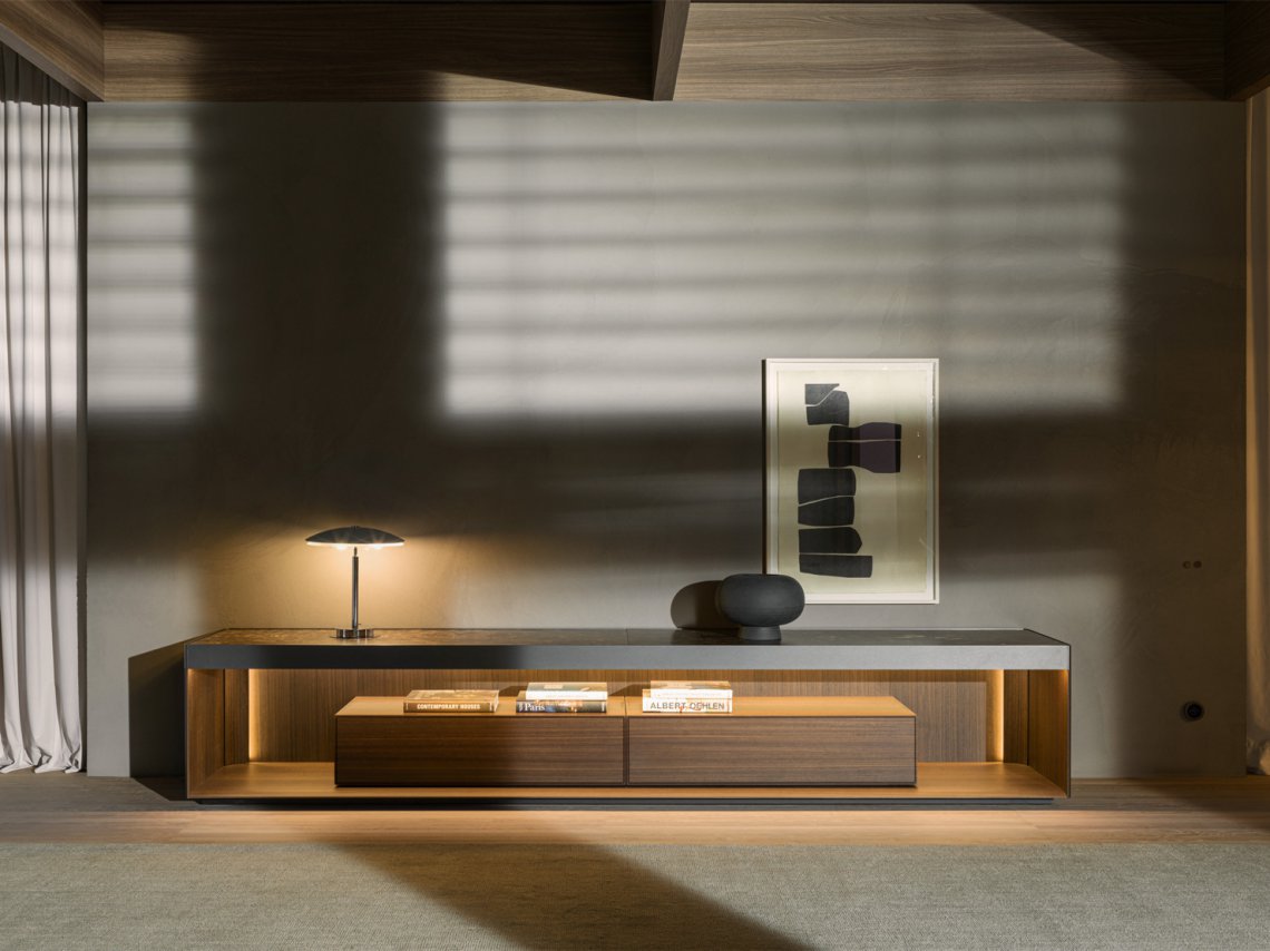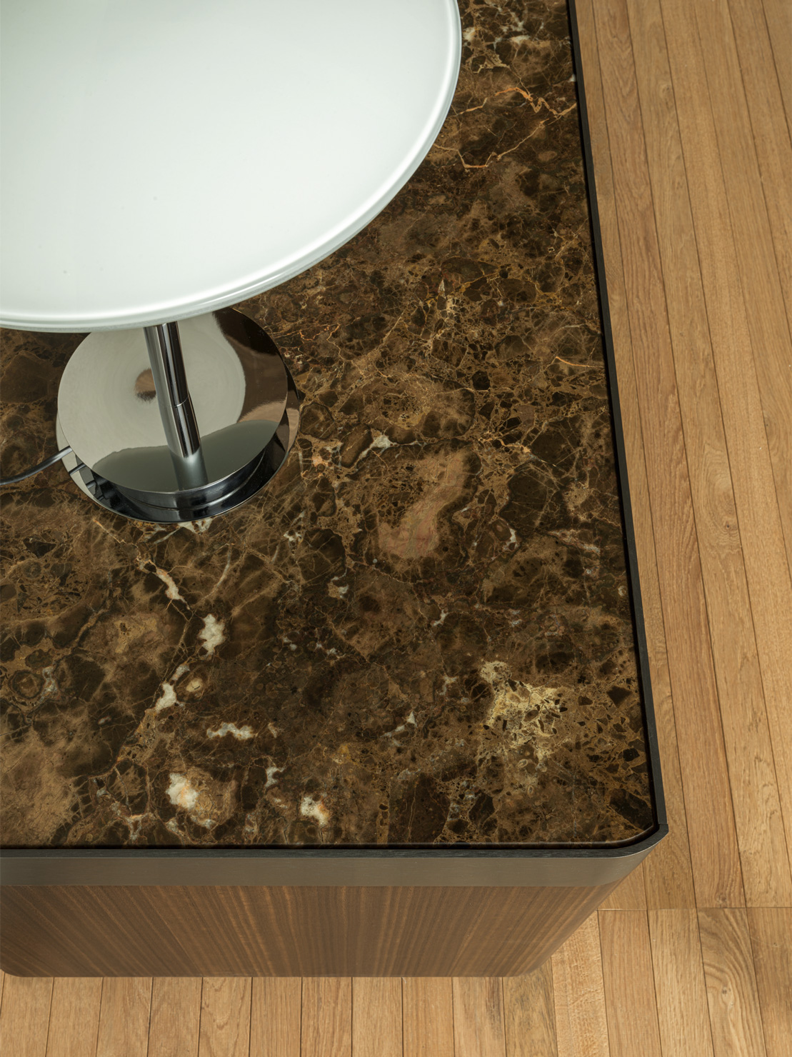 Living Box was conceived as an independent item of furniture, usable in any room of the house, but mainly suitable for the living room. Despite its reduced size, it retains the rigour and monumentality of the building it derives from, accentuating its details by means of quality materials. Living Box is a low, but large (230, 280, 330, 380) doorless rectangular container, in which the outside and inside contrast with each other via the use of different materials. The top features marble and different woods, specially arranged to decorate the surface. The whole is enclosed within an iris and pewter frame, thread-like if seen from above, but forming a thick profile surrounding the inside space if seen from the front.The top can be fitted and integrated with trunking, useful for facilitating connections of any kind between multimedia equipment, TVs or lighting equipment. The rest of the top can be left free or used to display artistic or personal ornaments.The inside space recalls a “magical cave” and features numerous surprises. The woods used, including Eucalyptus and the new Sunrise Oak finish, are the facing materials used, and which completely envelop and mark the perimeter.