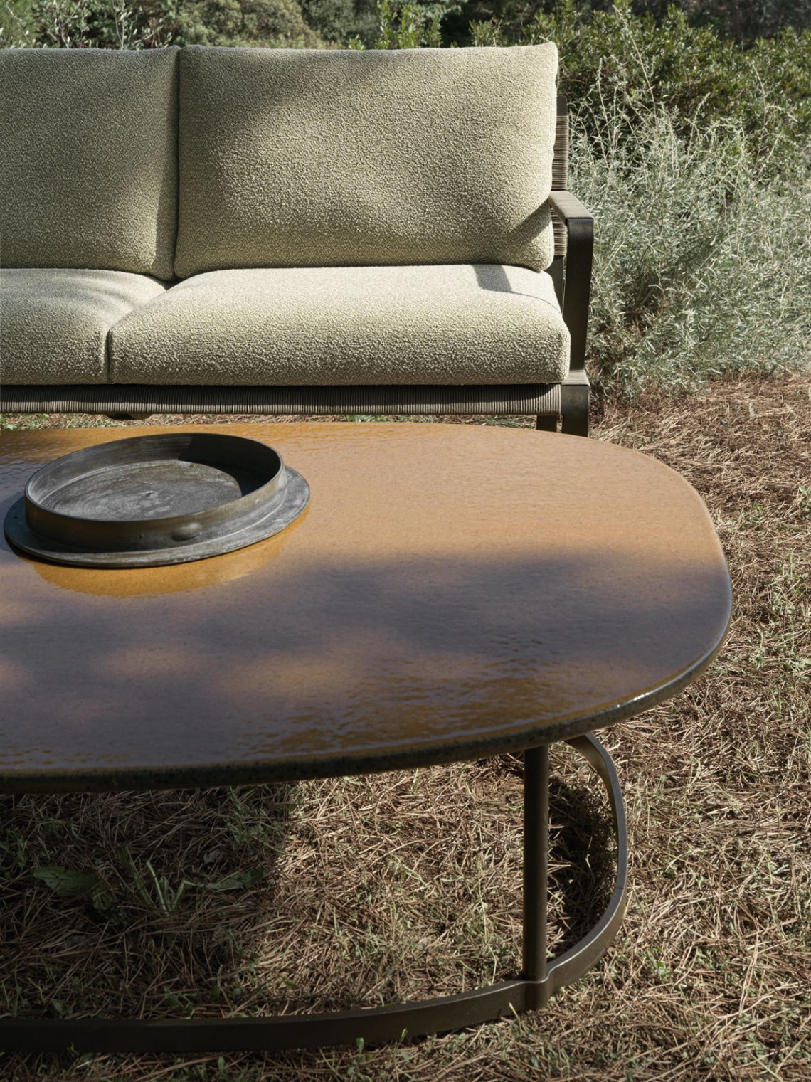 The Timeout Collection is characterised by the burnished painted aluminium band that frames all the profiles of the furniture like a ribbon, rounding off at the corners and thus creating, in a continuous stroke, the seat support, armrests and support feet. The latter, seen from the side, appear slender and light, giving a sense of dynamism.