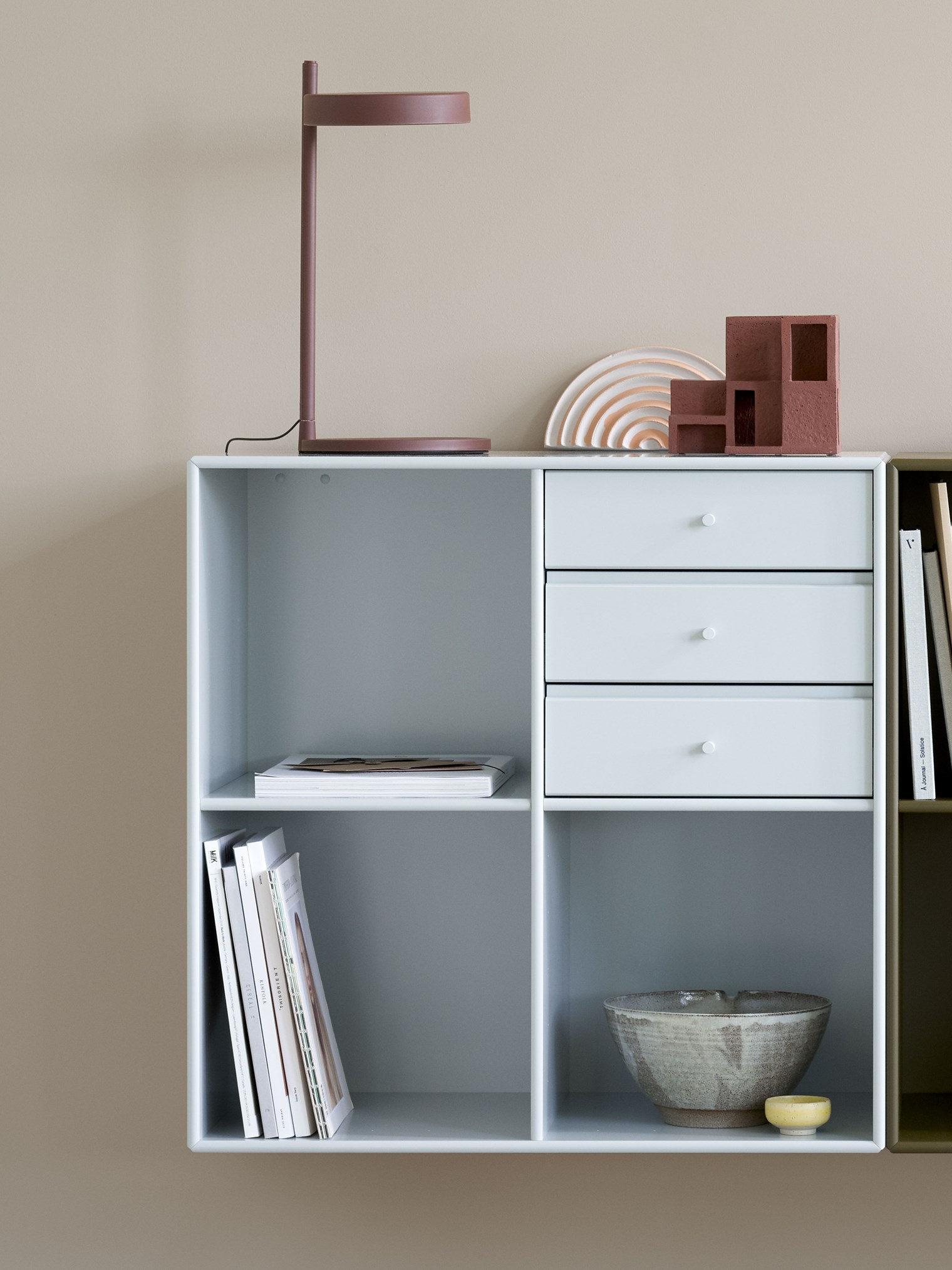 1324 架子有三個開放式隔間和三個抽屜。三個大型開放式隔間提供充足的存儲空間。例如,將一個隔間用作書架,將您最漂亮的碗放在另一個隔間中,將小綠色植物放在第三個隔間中。三個抽屜為您提供優雅且實用的封閉式儲物空間。從我們精心開發的眾多顏色中選擇您喜歡的顏色的 1324 架子。該架子有蒙大拿州全部 40 種環保漆色可供選擇。這種經典的蒙大拿州設計可以完美地單獨工作或與蒙大拿州系統的其他模塊結合使用。