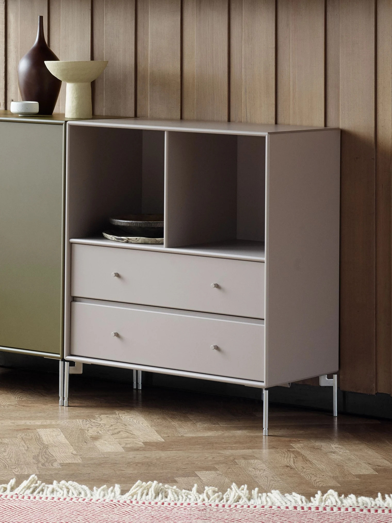 1325 架子有兩個(gè)開(kāi)放式隔間和兩個(gè)寬抽屜。在您的客廳中使用它來(lái)精致地存放餐桌上的酒杯和盤(pán)子。在抽屜里裝滿節(jié)日桌布和地毯,放在身邊總是很方便。該架子為您提供充足的抽屜空間和兩個(gè)大型開(kāi)放式隔間,在臥室或走廊上同樣適用。該架子有蒙大拿州全部 40 種環(huán)保漆色可供選擇。選擇您最喜歡的顏色,讓櫥柜以其美觀的功能,令人印象深刻地獨(dú)立存在。或者將其與 Montana 貨架系統(tǒng)中的其他模塊結(jié)合起來(lái),作為個(gè)人 SSL 的一部分。1325 柜體的深度有 30、38 和 46.8 厘米,并有鋁把手、漆把手或無(wú)把手。