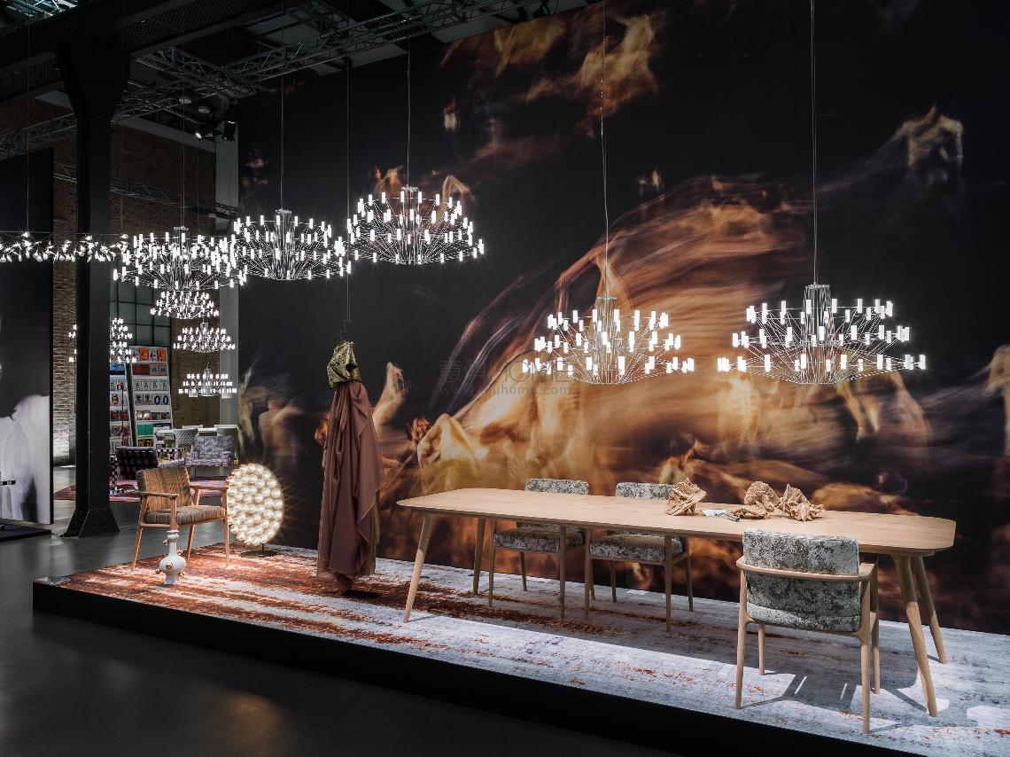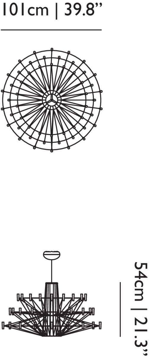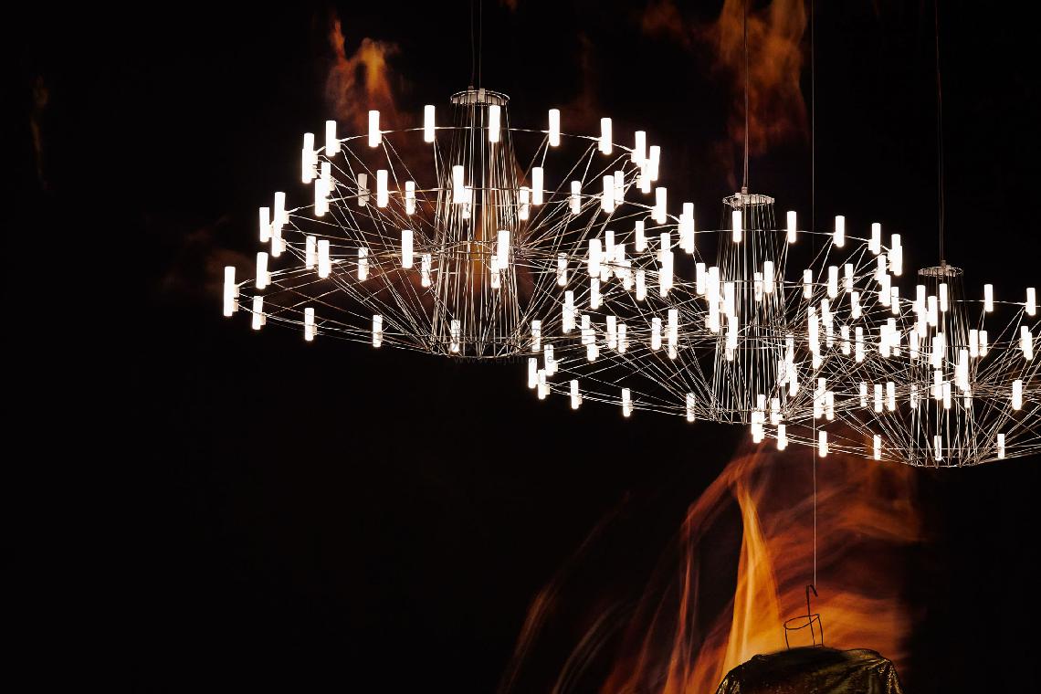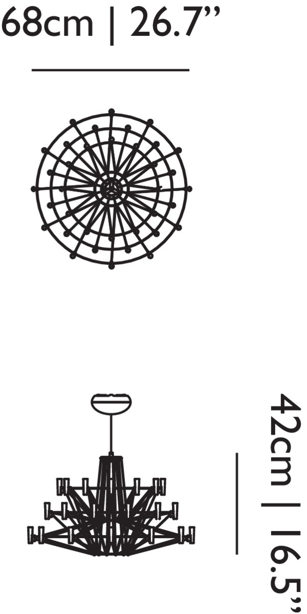 Coppélia comes to life in a whirl of flowing motion and sparkling light. With a graceful sense of wonder, a beautiful mechanical doll appears to magically come to life in the famous ballet Coppélia. In the performance the ballerina traces, with sinuous movements, a delicate after-image in the air, which inspires the fluid motion in the design of Miyake’s Coppélia Suspended Lamp. The graceful dance, staged by the three-dimensionally crossed wire structure, leads the spectator to dozens of glowing LED lights, which define the contour and the magical glow of Miyake’s interpretation of a classic chandelier.