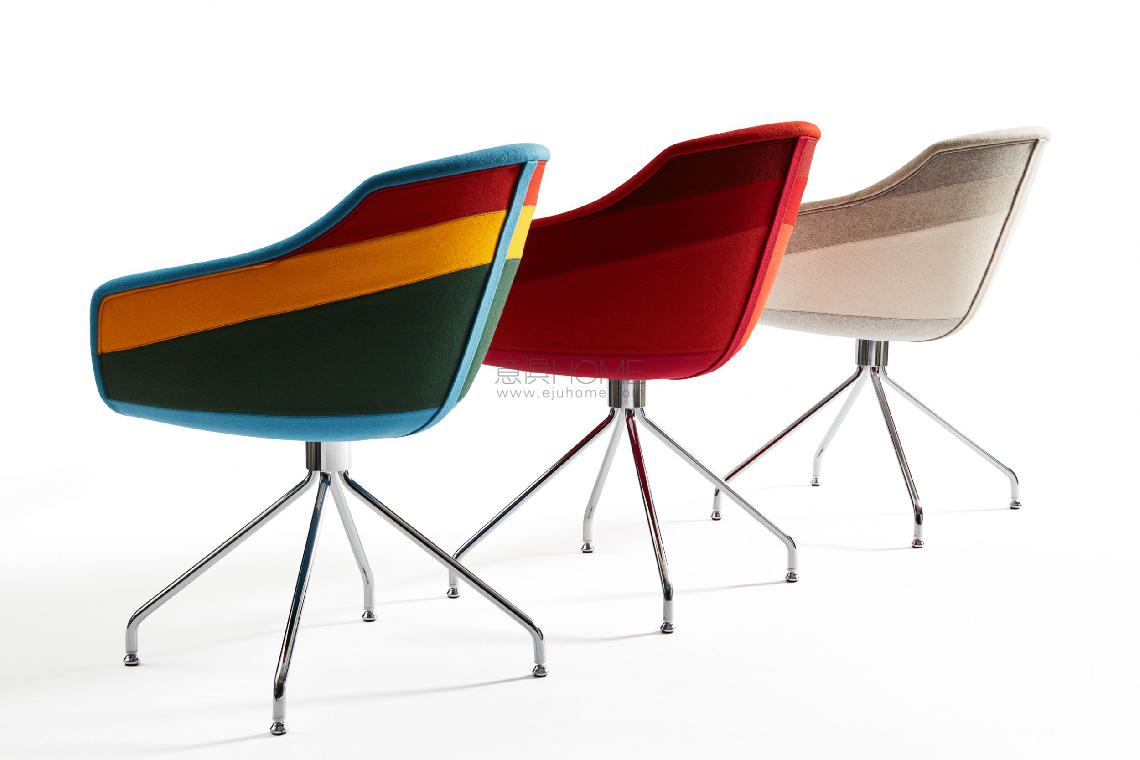 Mainly docked around a table in the manner of a moored boat, Luca Nichetto's Canal Chair is inspired by a historical type of ship that dominated the Mediterranean waterways for centuries. The Canal Chair resembles the bow of a boat and displays striking compositions of matching or contrasting textiles.