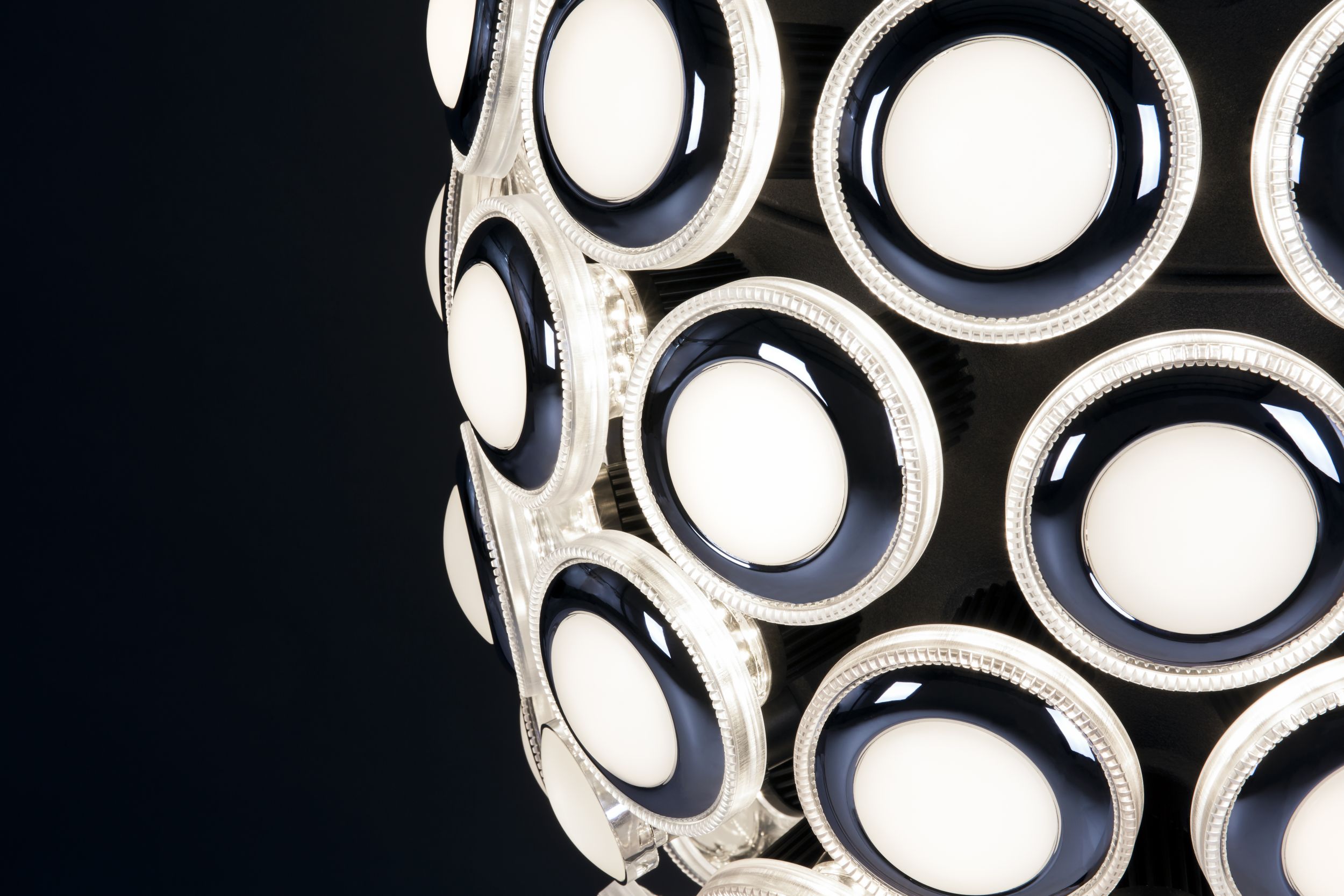 The first sparkle of this great idea was inspired by iconic automotive headlights. They have been modified to design a grand pendant light with a classy, powerful impact for the foyer of the Bavarian National Museum in Germany. The light’s oval design is modern with a classic touch. It generates a precious ambient glow enhanced by bright rings of light and is produced in two sizes. Glorious and breath-taking in appearance, it consists of numerous lenses and a constellation of LED lights.