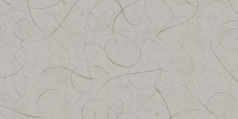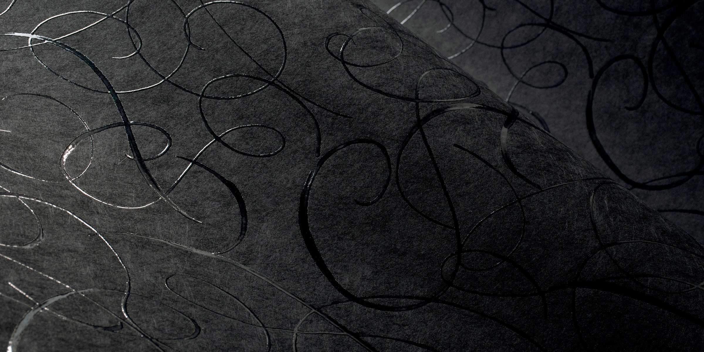 Wallcovering with a high gloss lacquer print, representing the elegant tail feathers of the female Calligraphy Bird that ended in what resembled graceful calligraphy swirls.