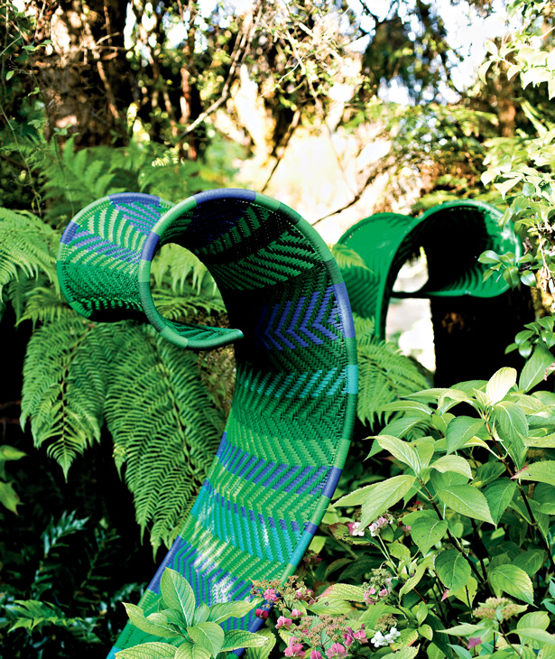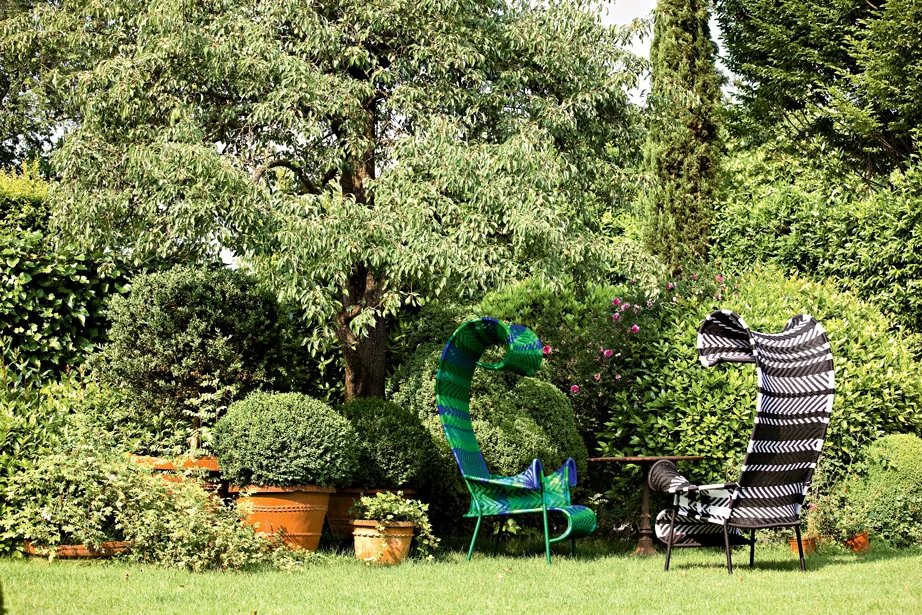 Struttura in acciaio verniciato e fili colorati in polietilene intrecciati a mano. Sottopiedi in PVC.