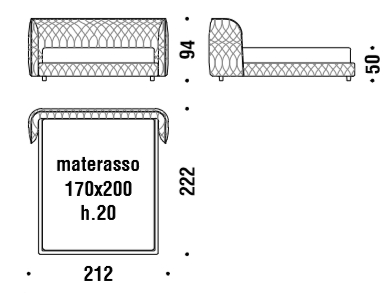 Struttura in legno rivestita in poliuretano espanso a densità differenziata. Supporti rete regolabili in altezza, i piedi sono in polipropilene nero 70mm. Può contenere solo materassi con misure standard europee. Il tessuto utilizzato per rivestire la collezione è trapuntato su disegno della designer Patricia Urquiola. I letti Redondo sono sfoderabili.