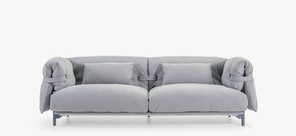Confort e morbidezza prima di tutto. Un divano open source, una scelta progettuale che privilegia l’aspetto di comodità della seduta che si vuole sempre più avvolgente e morbida nel suo impatto sia visivo che formale. La struttura è abbracciata da cinghie di maglia che si insinuano tra i morbidi cuscini invogliando al puro relax. Il rivestimento a pieghe sottolinea la spensieratezza non definita della forma, accentuata dall’uso del tessuto a maglia per le cinghie che la contengono. Un divano quindi destrutturato dalla costruzione atipica: una struttura in alluminio che può essere composta in libertà unendo i diversi componenti che interagiscono tra loro all’insegna della personalizzazione armoniosa.