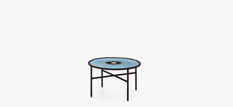 Struttura in acciaio verniciato e fili colorati in polietilene intrecciati a mano. Sottopiedi in PVC.