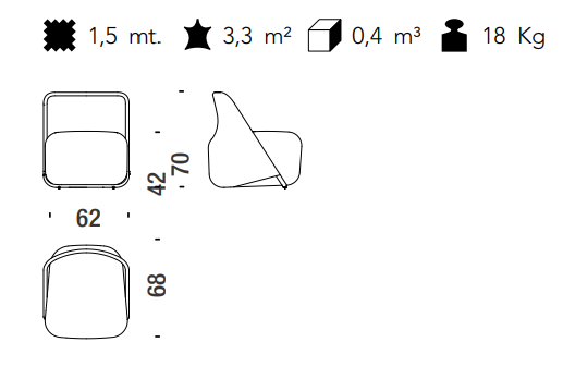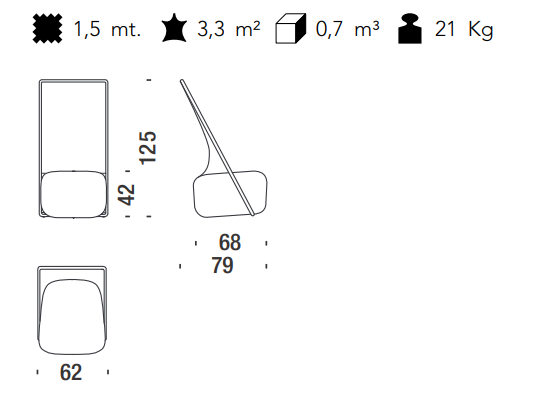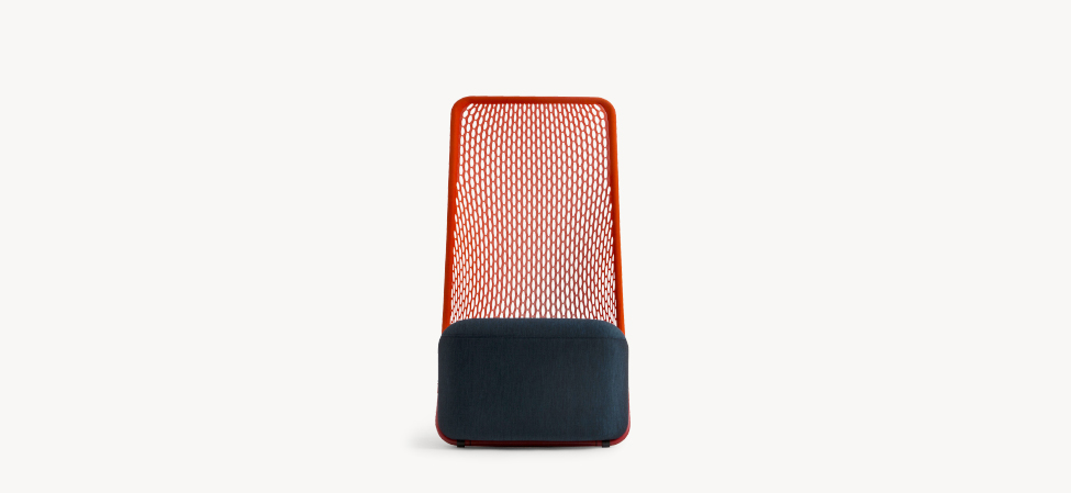 Seduta in poliuretano espanso ignifugo e fibra poliestere con struttura interna in legno. Schienale con struttura in acciaio verniciato a polveri e rivestimento in tessuto tecnico elastico. La collezione Cradle non è sfoderabile.