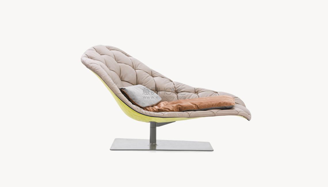 Confrontarsi con il “capitonné” interpretandolo in modo originale, rivoluzionandone il concetto. Patricia Urquiola disegna una famiglia di prodotti la cui forma sembra liquida, come se andasse a sciogliersi sulla struttura creando delle linee morbide, avvolgenti, quasi casuali, dove il tessuto o la pelle vengono fissati alla scocca con dei bottoni automatici. L’oggetto sembra indossare sulle spalle uno scialle, sulla seduta vengono sovrapposte una serie di cuscini di vario tipo: una ricerca del rivestimento quasi ossessiva, ricca, sovrapposizione di pelli e materiali diversi, colori, lavorazione del tessuto. Una sorta di patchwork di lusso che indossato, dona all’oggetto uno spirito nomade e globale.