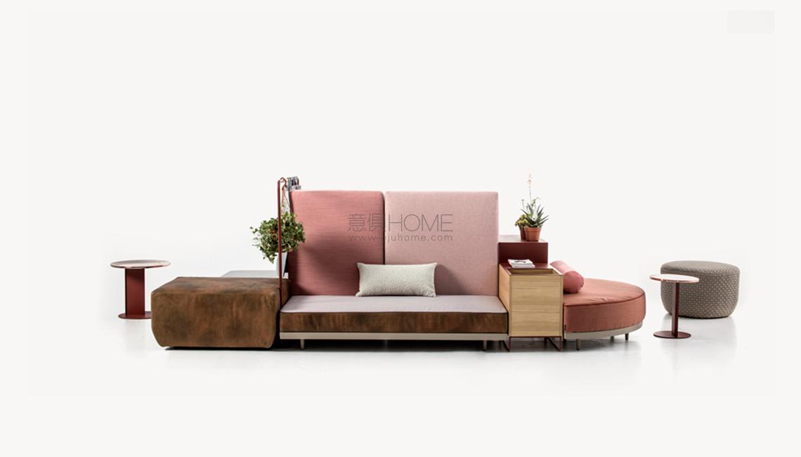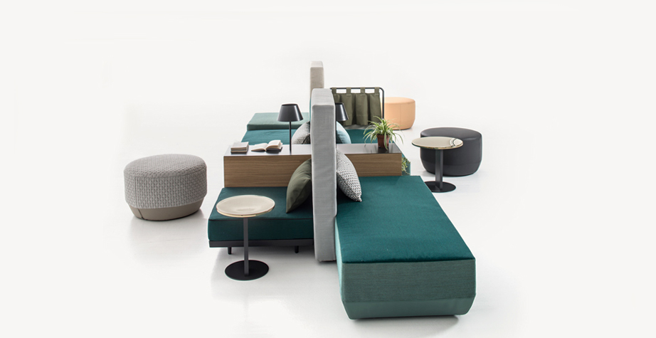 Progettare le relazioni, disegnare traiettorie per appropriarsi degli spazi che l’attualità dispone. Bikini è un paesaggio figlio del tempo e della società che lo esprime. Aree d’attesa, ambiente domestico, la flessibilità componitiva è legata alla mancata necessità di una corrispondenza tra conformazione dello spazio e disposizione degli elementi del sistema, che per varietà estetica e funzionale permettono una non comune trasversalità d’utilizzo. Sgabelli, tavoli, attaccapanni, contenitori, scaffali, separé, piani di appoggio e di seduta: ogni elemento concorre alla relazione e all’interazione. Un intreccio di funzioni e significati che sposta l’idea del divano da fronte televisivo o luogo del riposo a epicentro (aperto) di relazione.