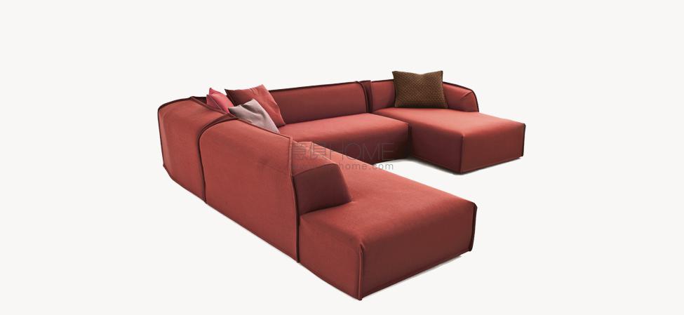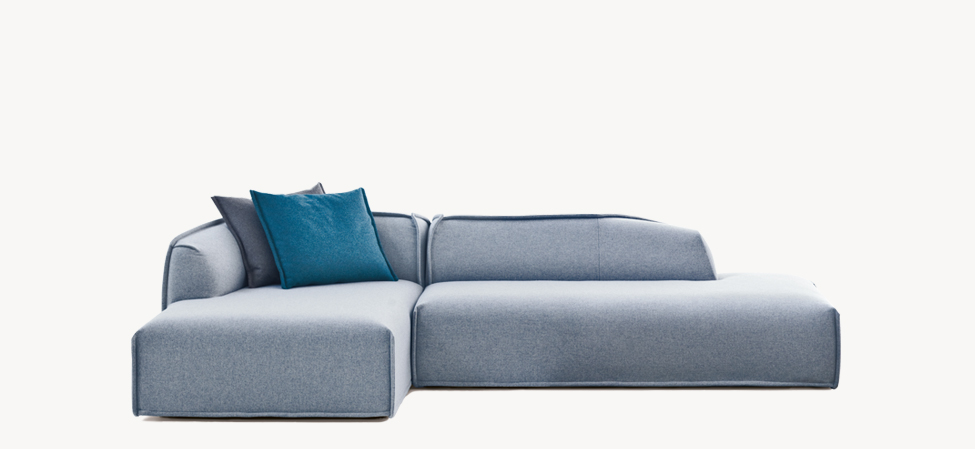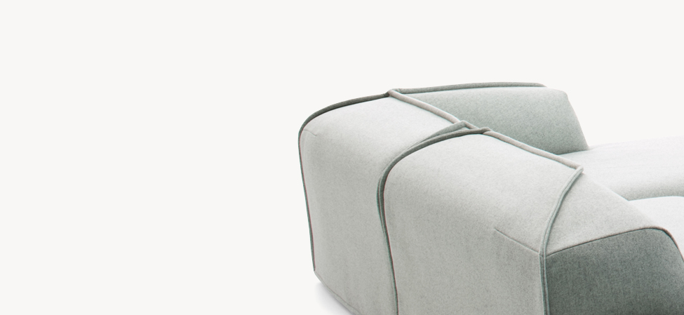 chi smussati dal taglio di una lama immaginaria. L’ordine geometrico è rotto, travolto a favore di un movimento, di un margine che attraversa i perimetri. Le facce rendono evidente la nervatura; alcune cuciture, evidenti come imbastiture, la disegnano, altre scompaiono. L’utilizzo è libero, la superficie morbida. La forma esterna, dal punto di vista dei volumi, appare indipendente dalla struttura e dall’imbottitura interna. Divano, poltrona, poltroncina: un sistema componibile dove ogni elemento mantiene indipendente il carattere, per funzione e presenza scultorea.