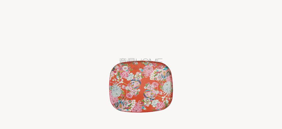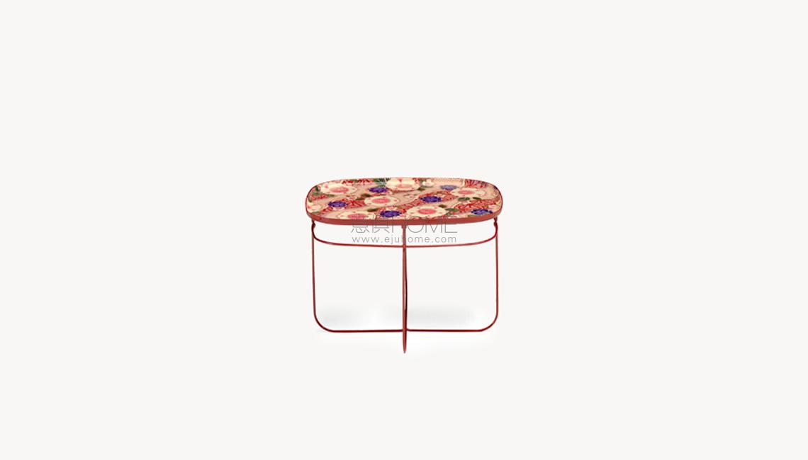 Tavolino dalla struttura leggera in filo di acciaio rosso (RAL 3003), contrapposta all’importante decorazione che usa il tessuto di Kimono tradizionali co-stampato con resina poliestere per il piano d’appoggio.