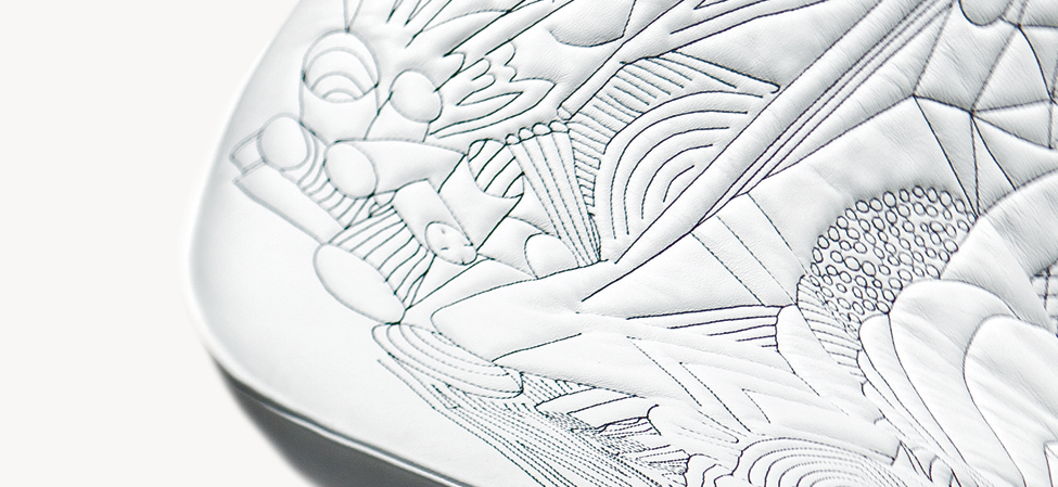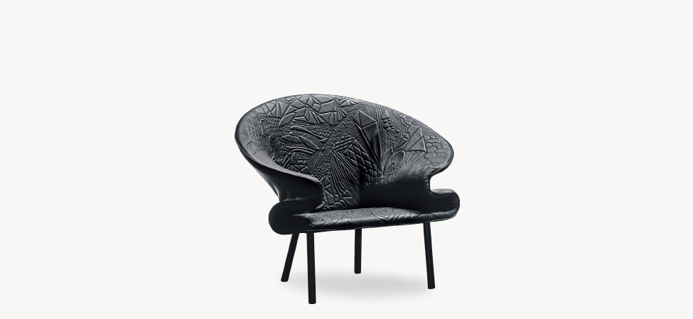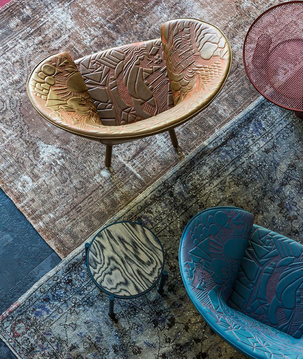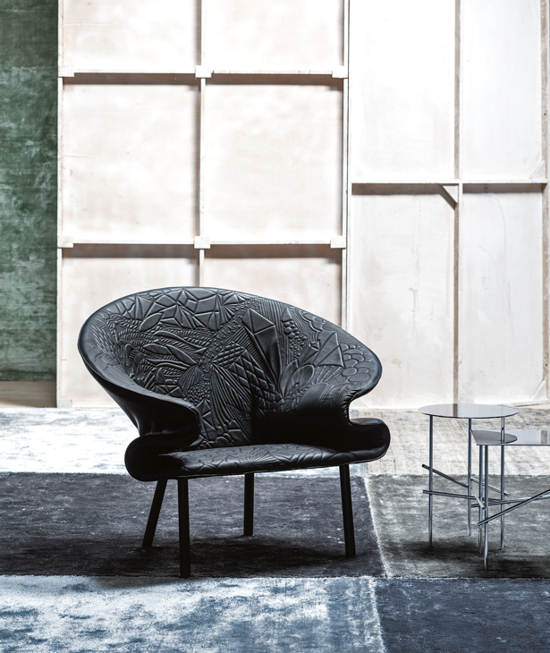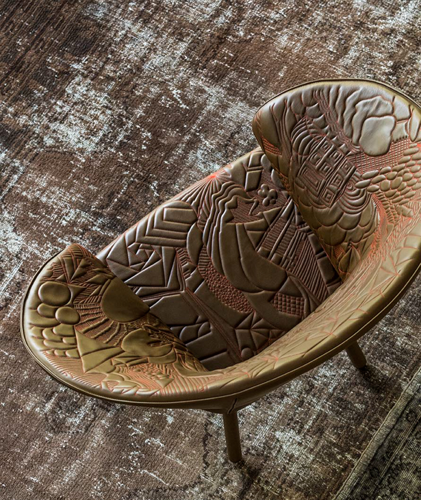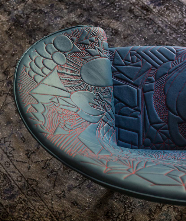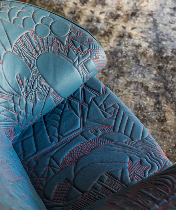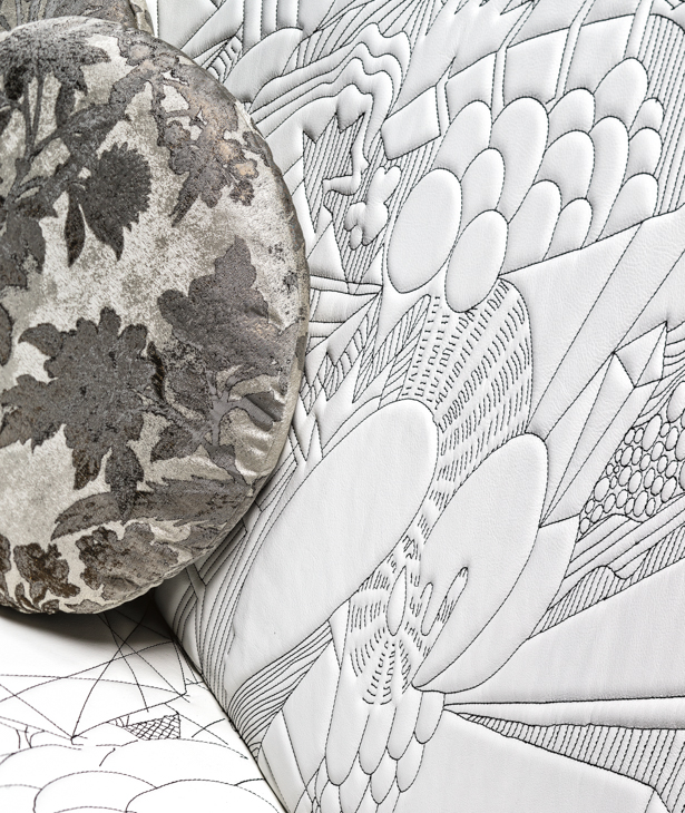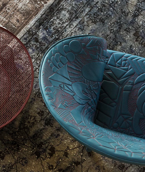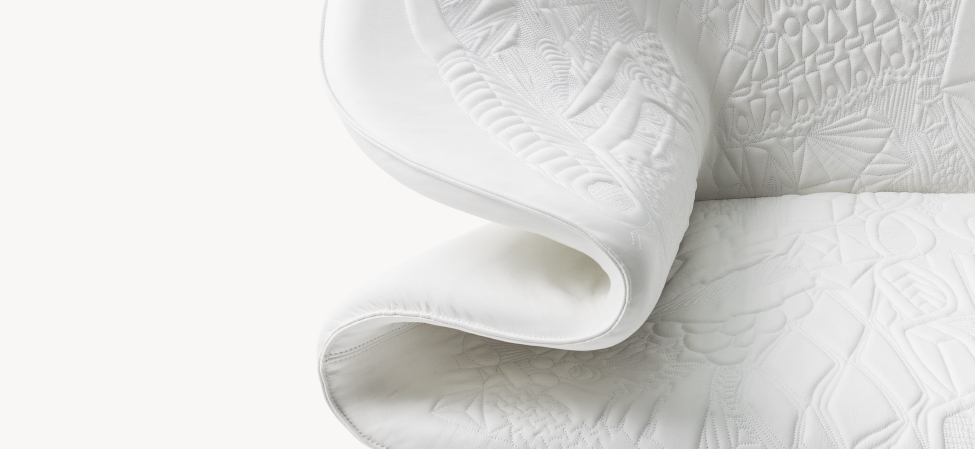 Dalla mano che sola disegna sul foglio durante una telefonata, escono tracce di pensiero. Riflessioni innocenti scandite da una progressione accumulativa, gesti spontanei, scarabocchi; si inizia da una linea, si arriva a una composizione articolata e complessa. è il pretesto per il ricamo. Il progetto del divano riprende la forma di una coperta ripiegata. La seduta è delicata, assorta, i braccioli morbidi, la forma accogliente. Il rivestimento trapuntato segue le linee dello scarabocchio, gli conferisce tridimensionalità. è un pensiero che ci accoglie, un sogno ad occhi aperti.