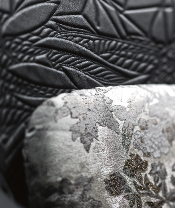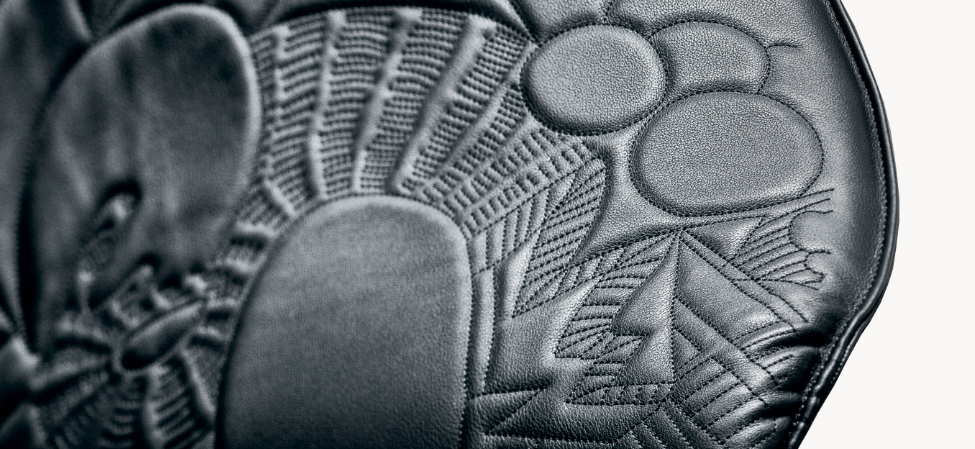 Espanso schiumato a freddo ignifugo e fibra poliestere con struttura interna in resina e acciaio. Piedi in tubo di acciaio verniciato a polveri e rivestiti in pelle con sottopiedi in polipropilene nero. Va utilizzata una pelle molto morbida, la Elmo Soft o Soft Ciré con ricami sempre in tono al colore della pelle disponibile in molti colori. La collezione Doodle non è sfoderatile.