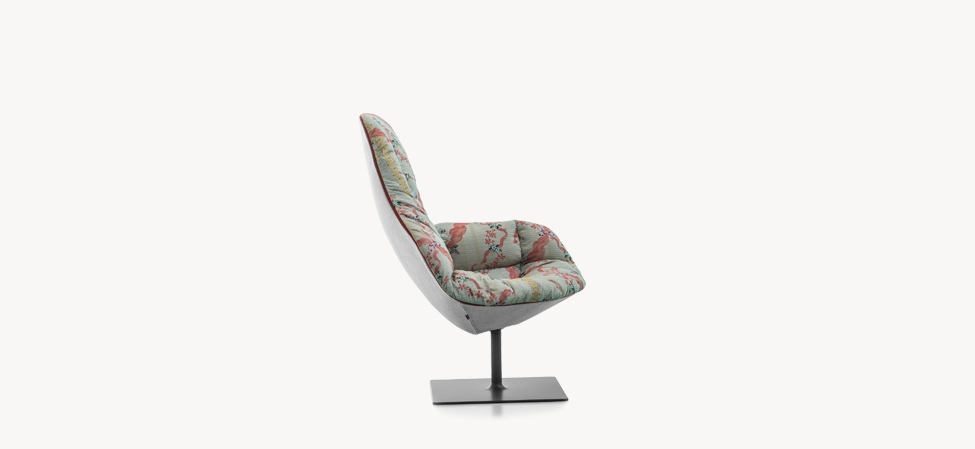 Poltrona girevole in espanso schiumato a freddo ignifugo con struttura interna in acciaio. Base quadrata in acciaio verniciato a polveri. Disponibile con rivestimento fisso (cod. 03K) o predisposta (cod. 03G) per l’aggiunta di trapunta in cotton gel (cod. 340).