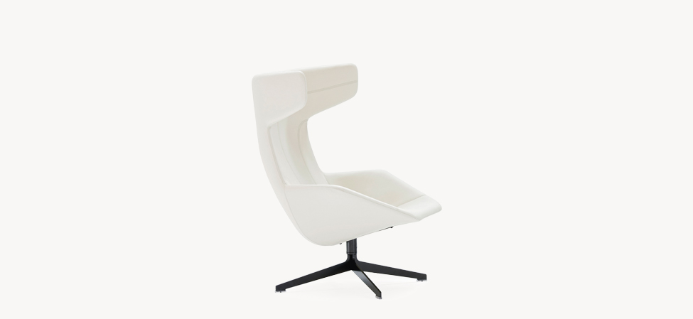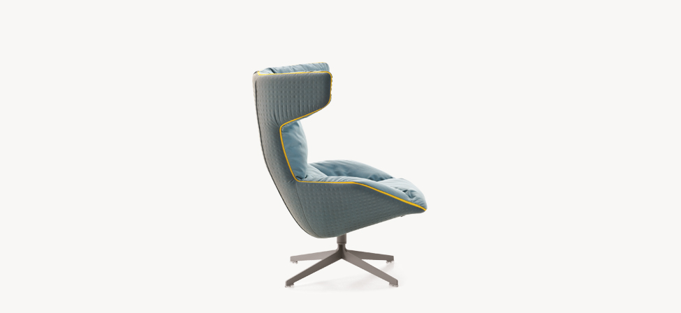 Espanso schiumato a freddo ignifugo con struttura in acciaio. Basamento a 4 punte verniciato girevole (cod. 0V6, 389). La poltrona è disponibile con trapunta imbottita (cod. 340) o con tessuto trapuntato (cod. 354). La collezione Take a line for a walk non è sfoderabile.