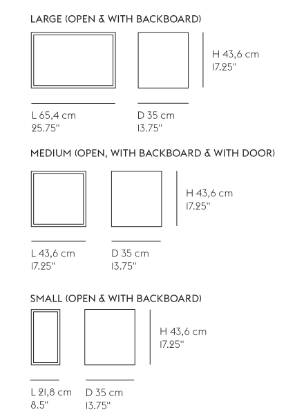 Being both versatile and functional, the Stacked Storage System can be arranged and rearranged for the exact aesthetic and functional needs of any space. Seen here is a selection of predesigned sideboard configurations that bring modern storage to any home, workplace or hospitality setting. All modules with backboard can be mounted directly onto the wall.