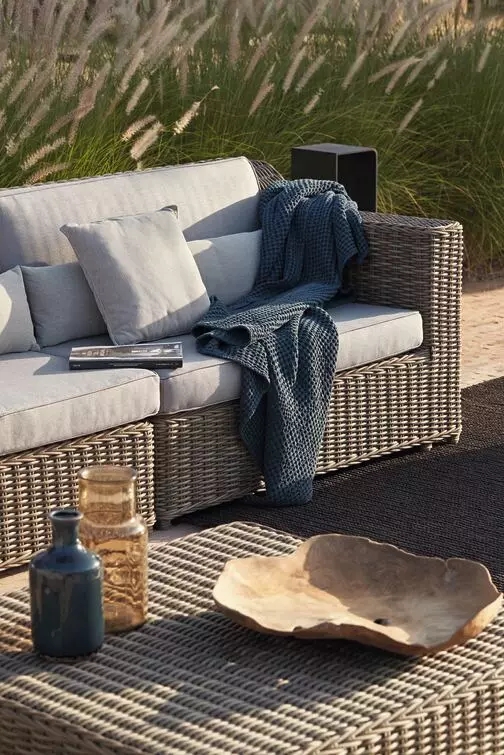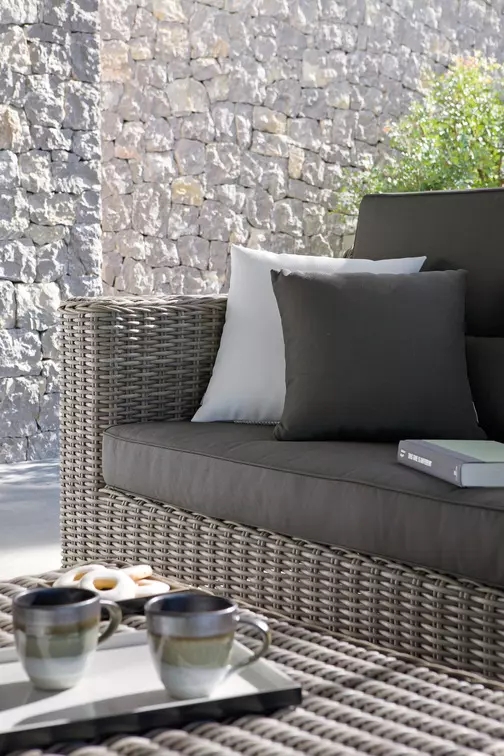 The San Diego collection of tables, chairs, sofas and accessories combines strong water-repellent fabrics and synthetic aged rattan cane work. Designed with a stark, minimalistic eye to detail, each piece also includes the softer, organic appeal of wicker. Natural materials and tones add to the collection’s ageless appeal.