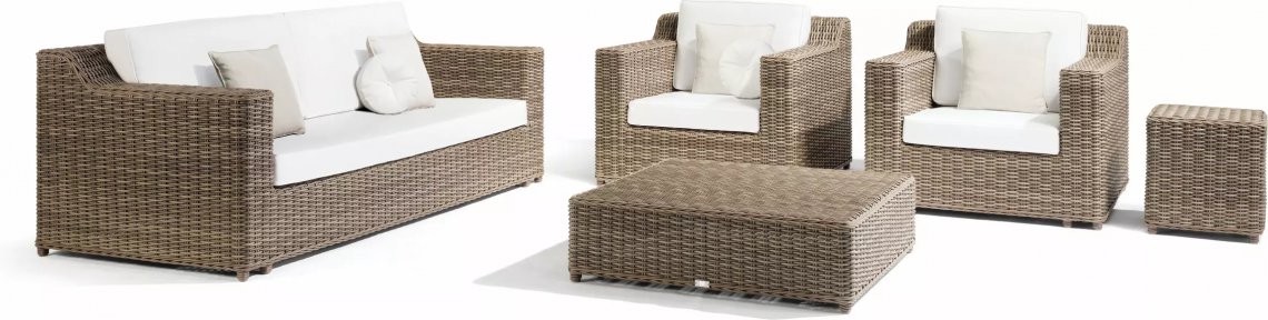 The San Diego collection of tables, chairs, sofas and accessories combines strong water-repellent fabrics and synthetic aged rattan cane work. Designed with a stark, minimalistic eye to detail, each piece also includes the softer, organic appeal of wicker. Natural materials and tones add to the collection’s ageless appeal.