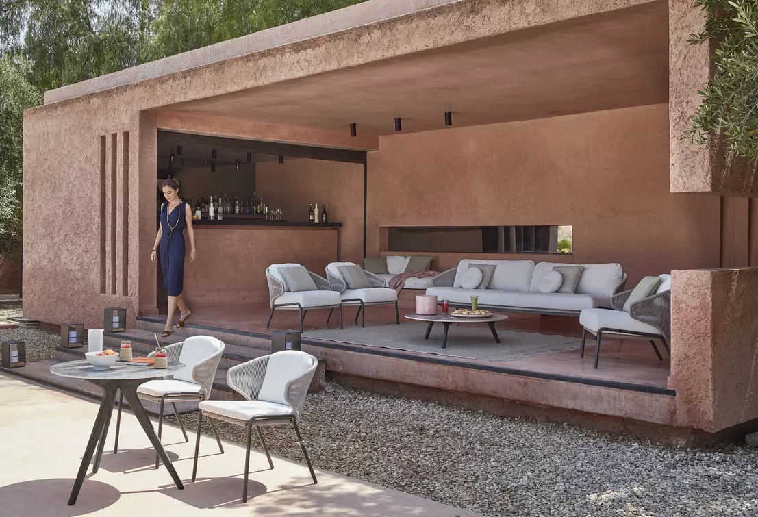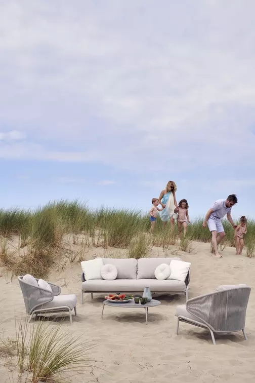 The unique, airy design of the Radoc chair, footstool, lounge chair and sofa collection is perfect for exquisite moments of warmth and closeness. The wrap-around back and armrests, made entirely out of rope, blend seamlessly and give each piece a neomodern yet timeless look and feel. Keep it sober or opt for matching backrest cushions designed for optimal seating comfort for long get-togethers.