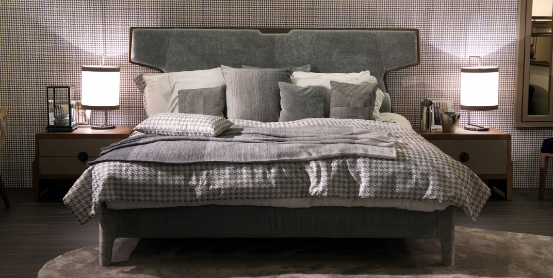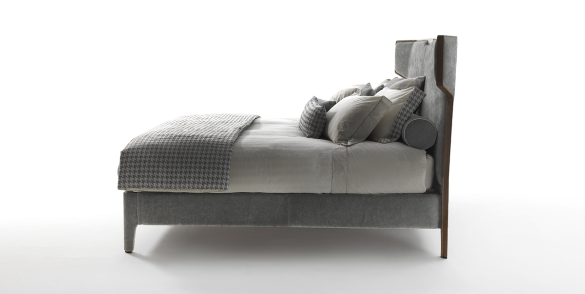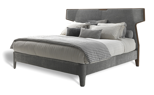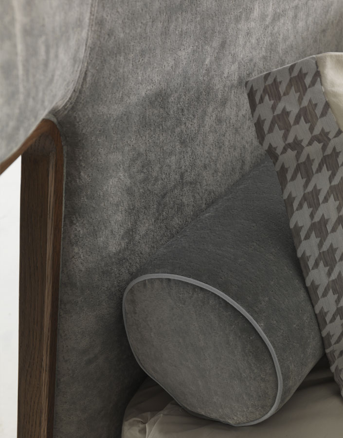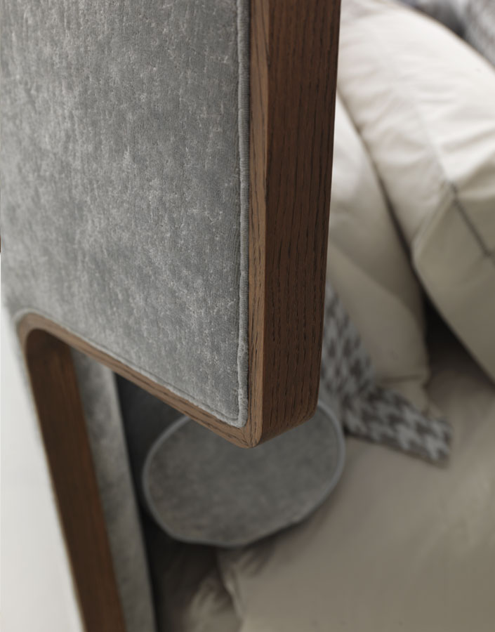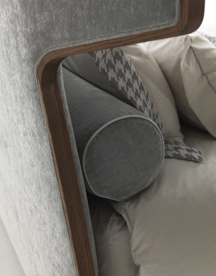 Letto con struttura in legno, testata e giroletto imbottiti.