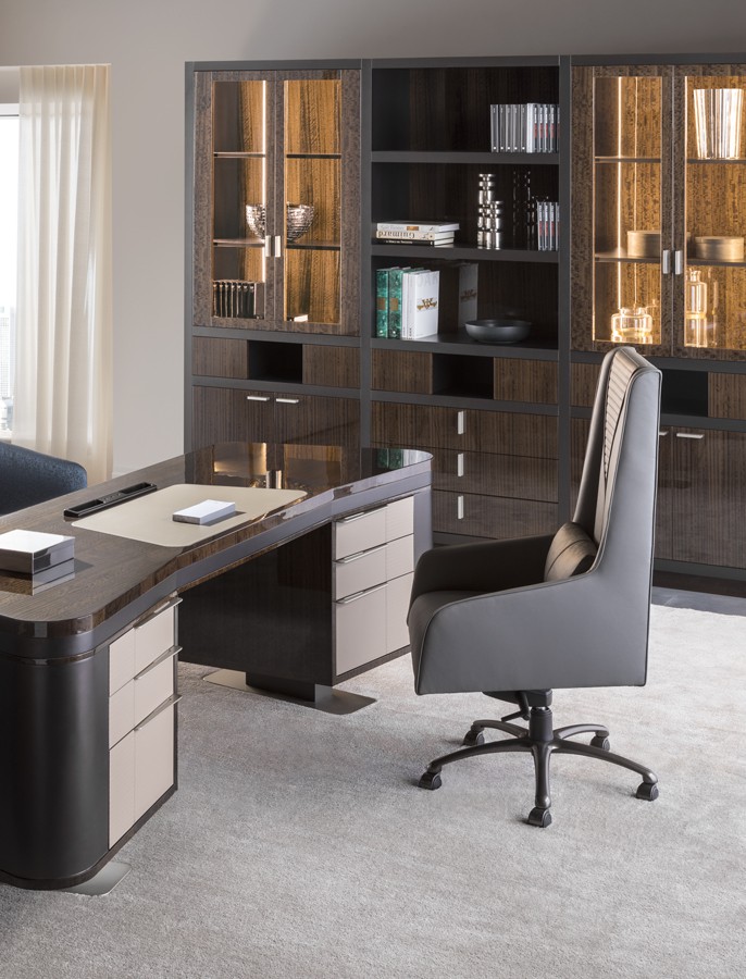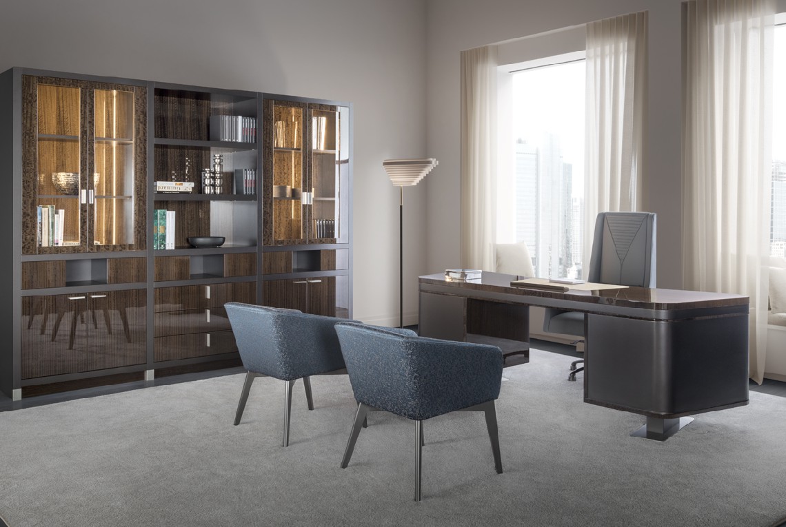 Poltrona girevole imbottita. Rivestimento in tessuto o pelle.