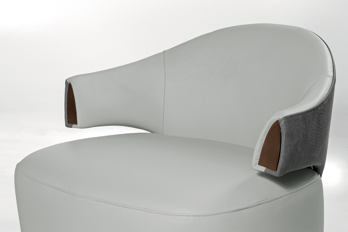 Armchair with structure in wood, upholstery in fabric or leather. Bronze lacquered details.