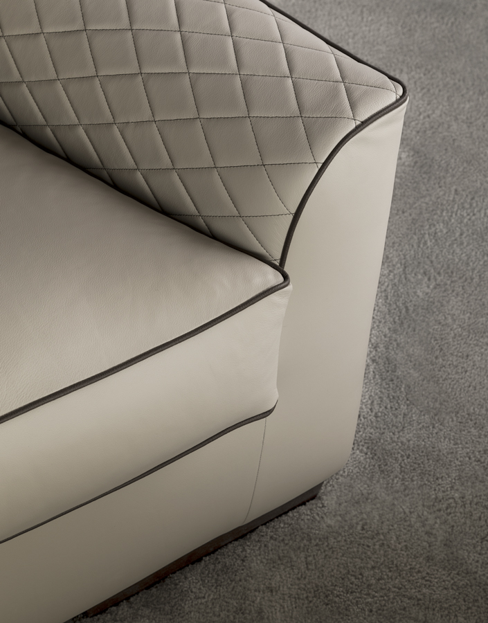 Poltrona con struttura in legno e rivestimento tessuto o pelle. Piedini in legno.