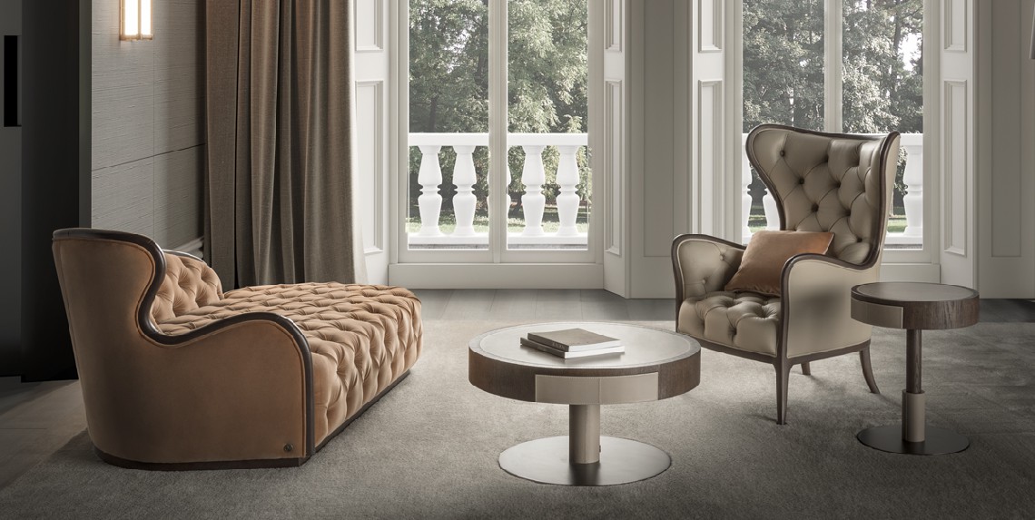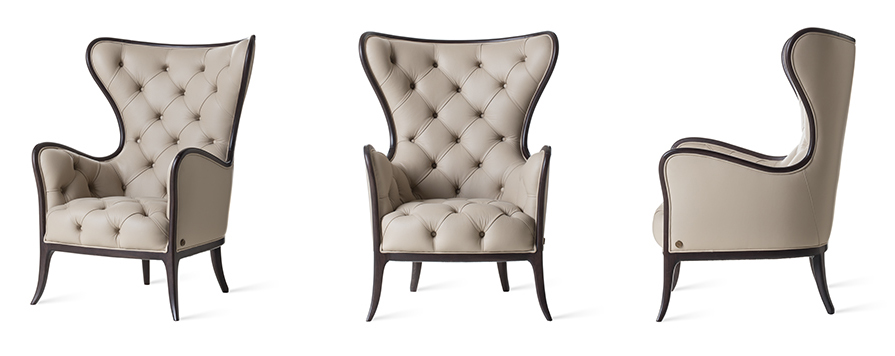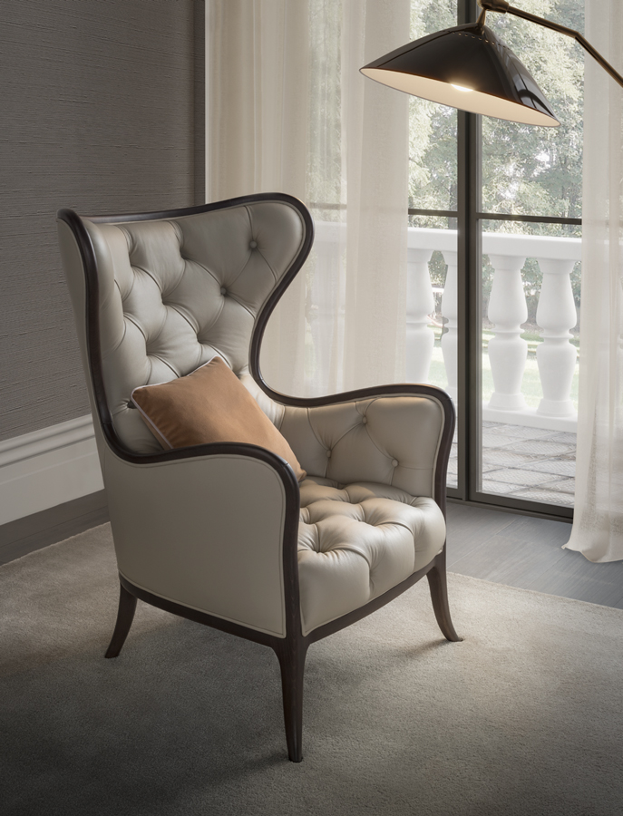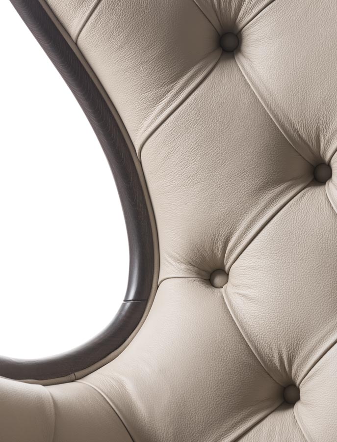 Armchair with wooden structure and capitonè. Upholstery in fabric or leather.