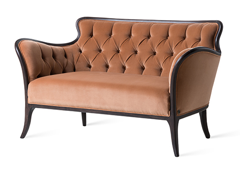 Divanetto con struttura in legno, seduta liscia e schienale capitonè. Rivestimento in tessuto o pelle.