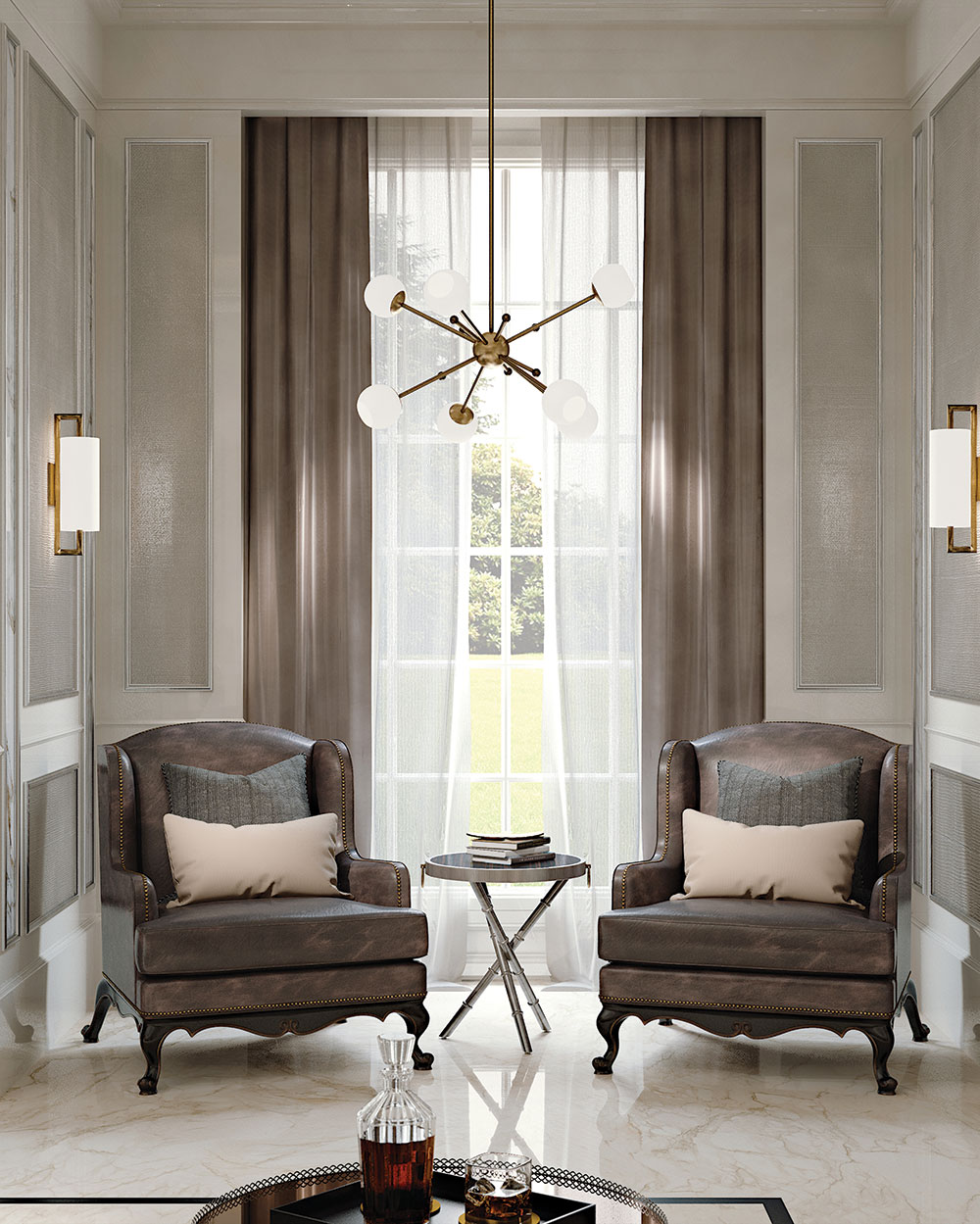 Upholstered in fabric or leather. Decorative metal nails. Decorative cushions.