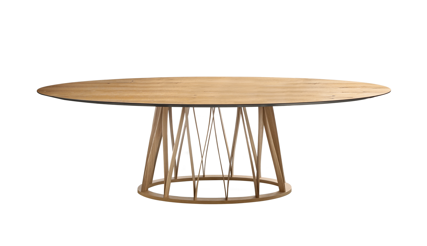 Acco is an elegant dining table with a strong character that resists labelling. It displays a mature, sophisticated language, which is developed through the design of the base frame with its distinct regular pattern of wooden lines.
