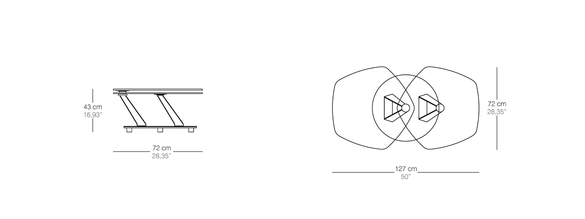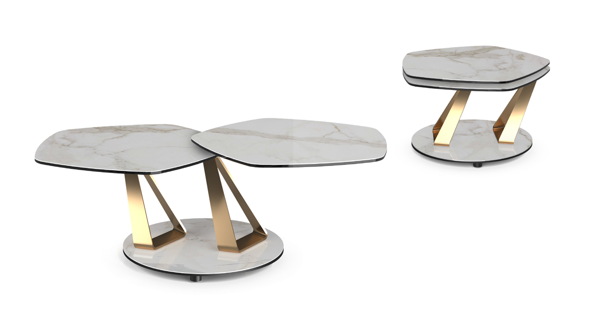 TAVOLINO ESTENSIBILE CON PIANI GIREVOLI SINCRONIZZATI DISPONIBILI IN VETRO O CERAMICA. BASE IN CERAMICA O IN FINITURE VERNICIATE. SUPPORTI VERNICIATI O CROMATI. LA BASE E' DOTATA DI UN MECCANISMO DI ROTAZIONE SINCRONIZZATO, CHE CONSENTE UN' AMPIA MODULAZIONE DELLA FORMA.