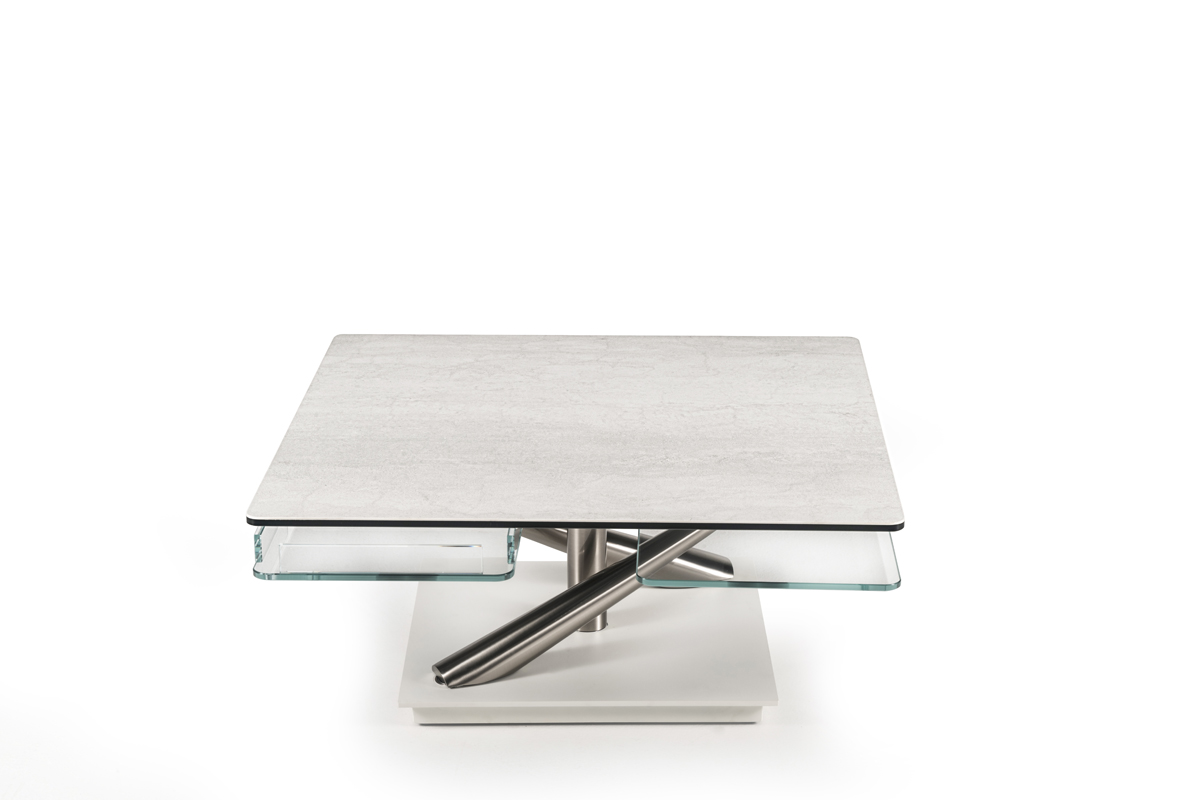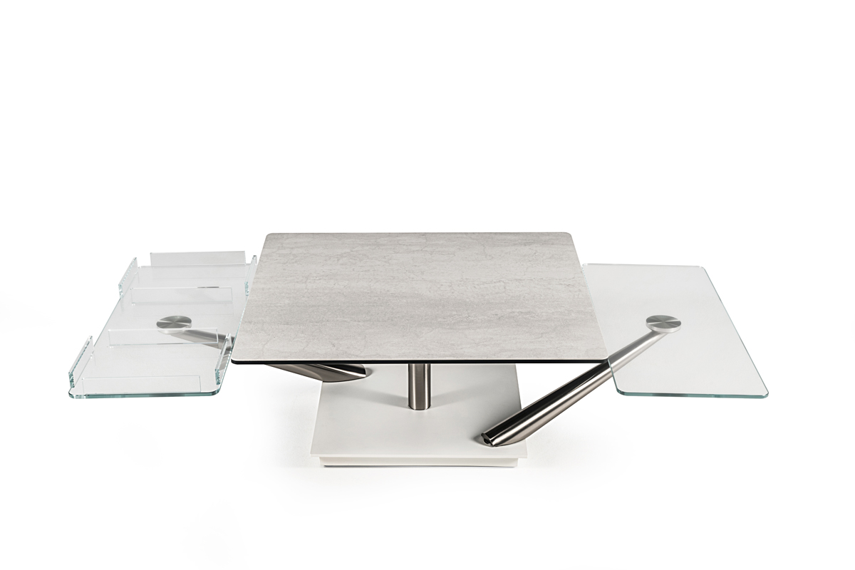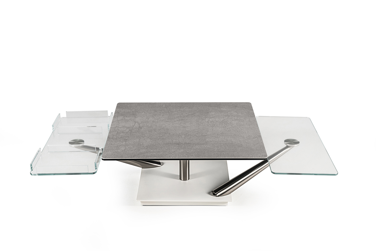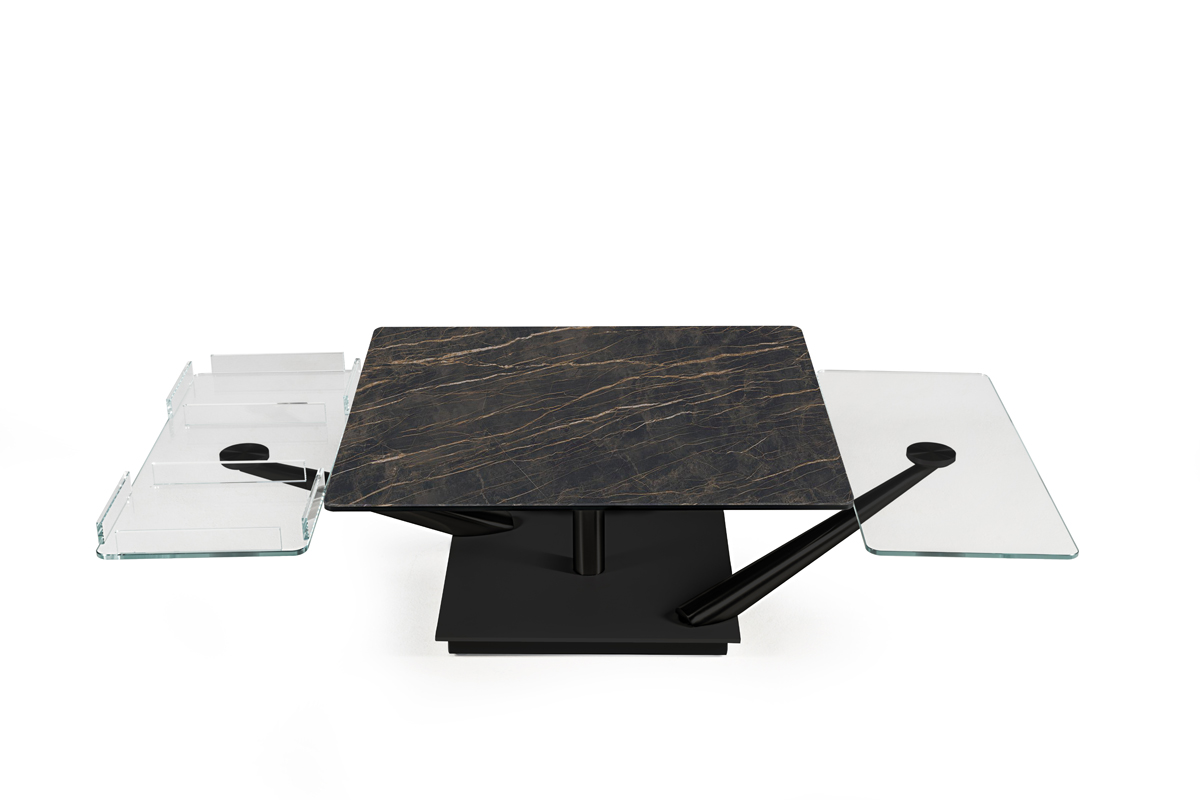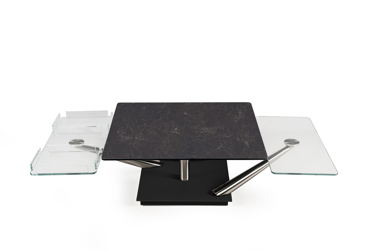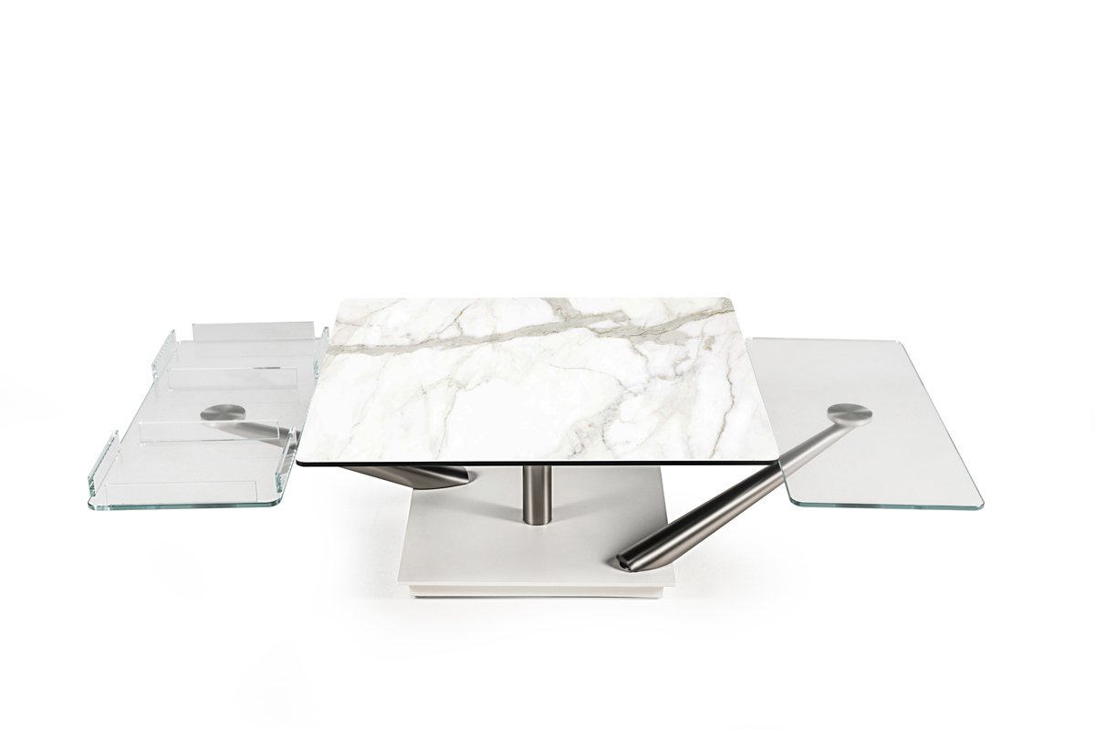 TAVOLINO ESTENSIBILE CON PIANI GIREVOLI SINCRONIZZATI. BASE IN ACCIAIO VERNICIATO. SUPPORTI IN ACCIAIO VERNICIATO O GALVANIZZATO. PIANO SUPERIORE IN CRISTALLO O CERAMICA. POSSIBILITA' DI AVERE UNO DEI PIANETTI INFERIORI IN CRISTALLO IN VERSIONE CASSETTO.