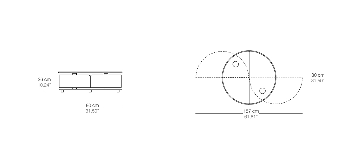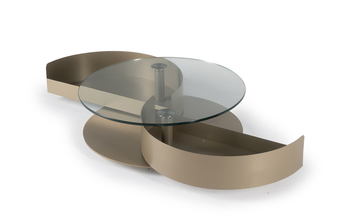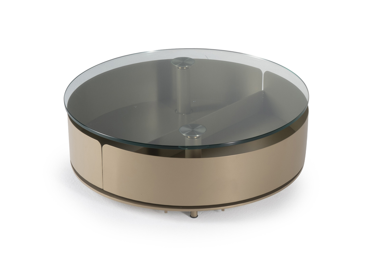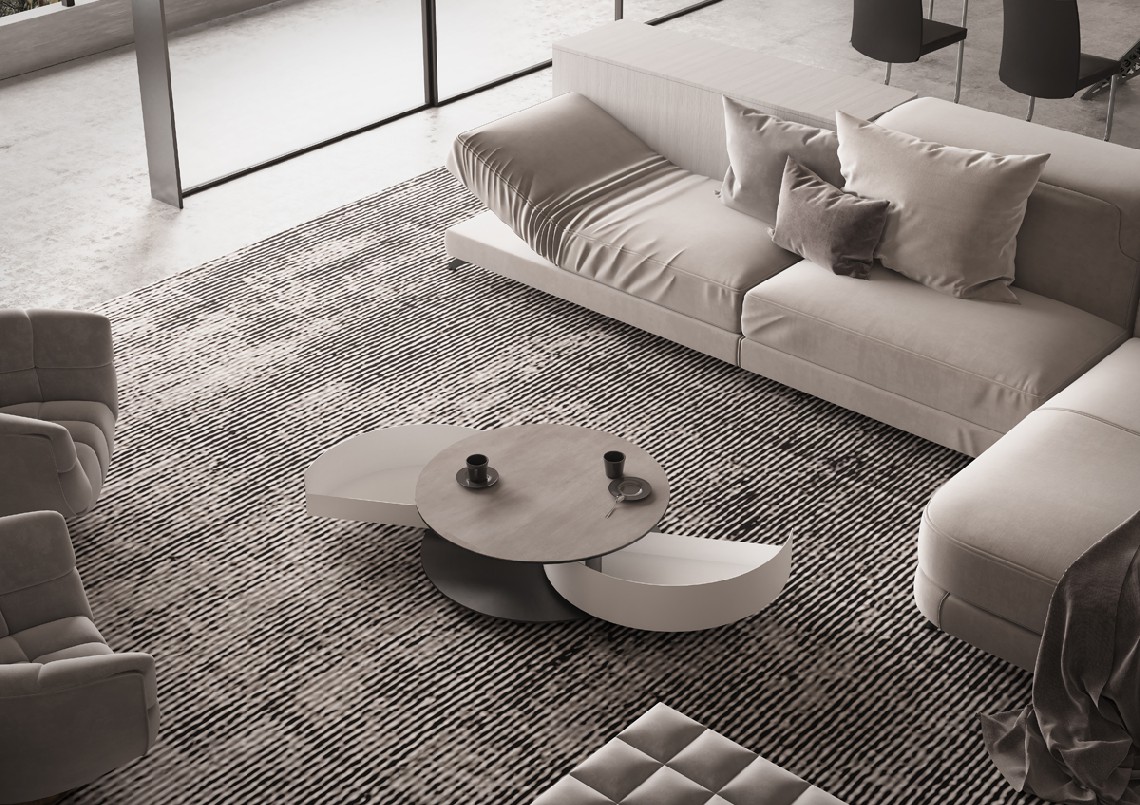 TAVOLINO ROTONDO APRIBILE CON PIANI IN CERAMICA O IN CRISTALLO. BASE E CASSETTI DISPONIBILI NELLE FINITURE VERNICIATE. DOTATO DI MECCANISMO PER L'APERTURA SINCRONIZZATA DEI 2 CASSETTI.