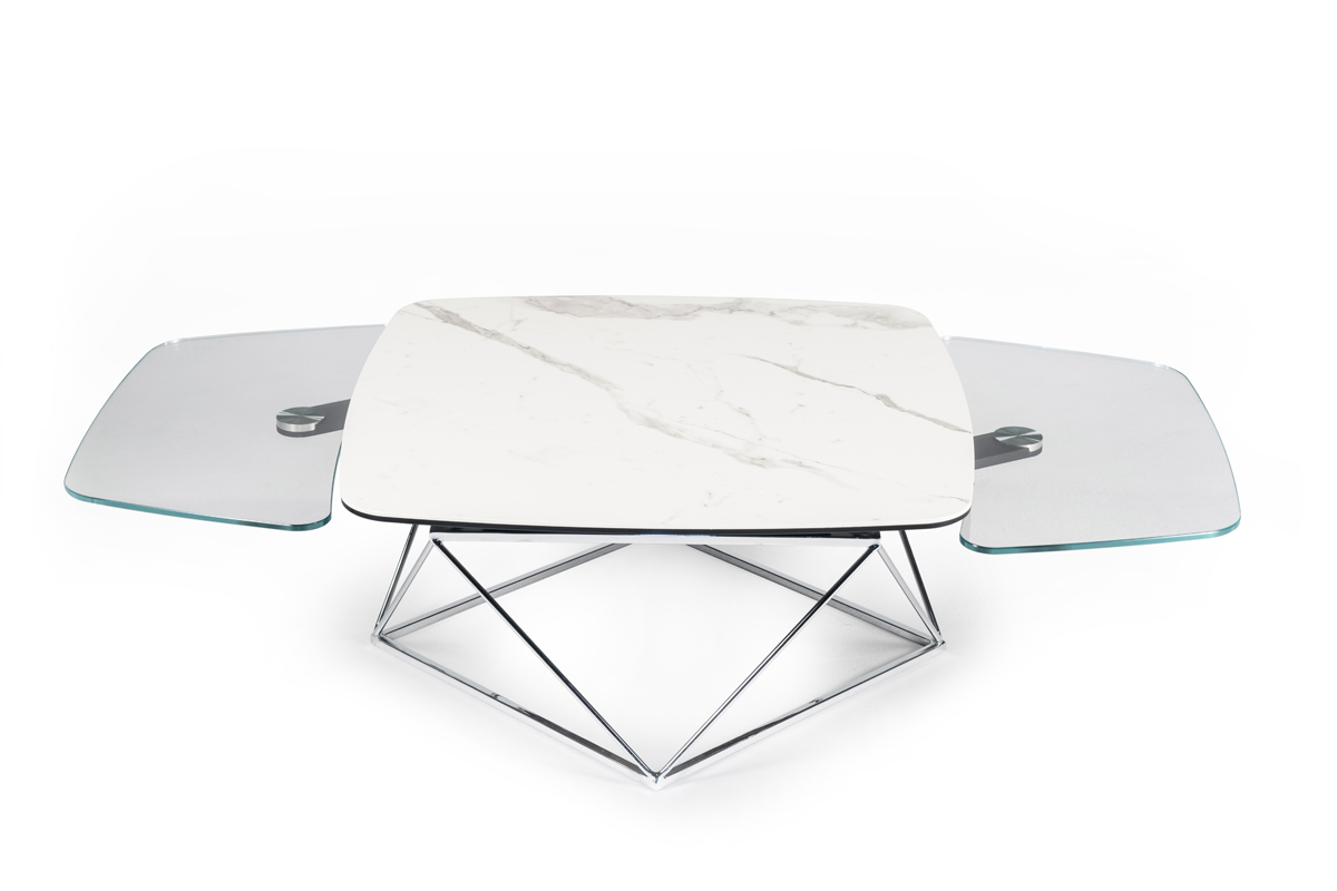 TAVOLINO ESTENSIBILE CON PIANI IN CERAMICA E CRISTALLO, BASE IN ACCIAIO VERNICIATO O GALVANIZZATO. DOTATO DI UN INNOVATIVO MECCANISMO CHE, ATTRAVERSO LA SOLA ROTAZIONE DEL PIANO SUPERIORE, PERMETTE AI DUE PIANETTI SOTTOSTANTI DI APRIRSI. DISPONIBILE ANCHE SENZA MECCANISMO.