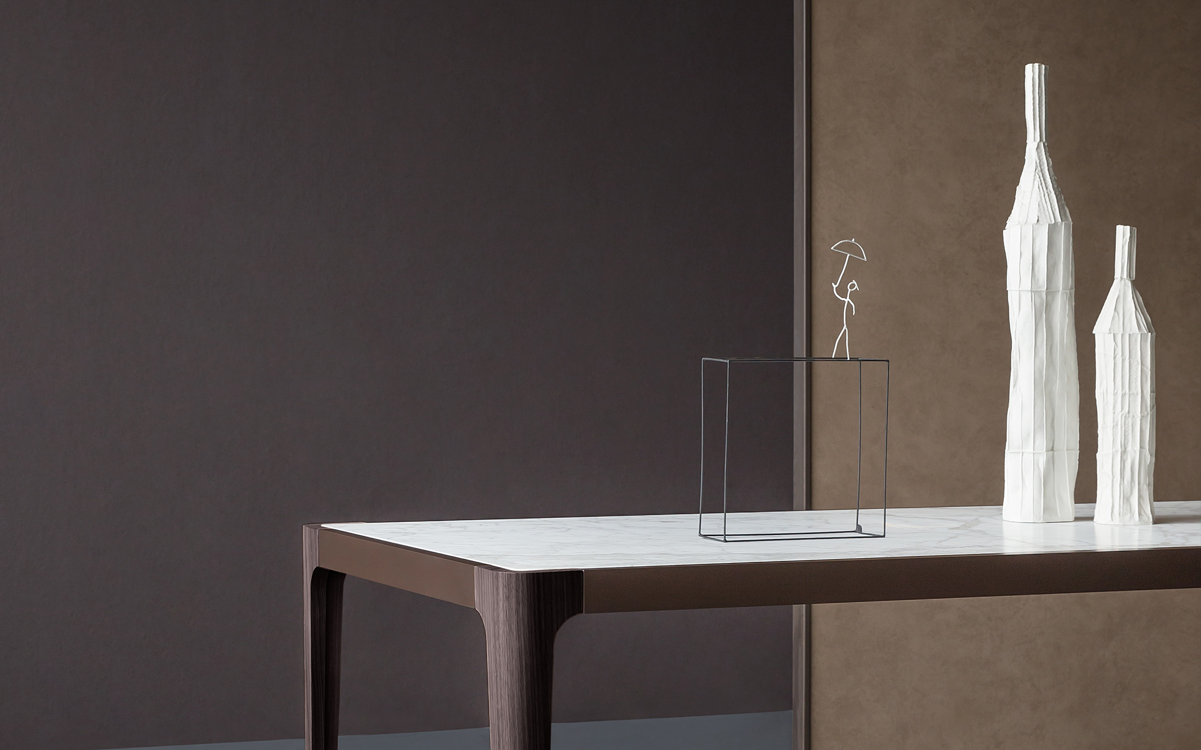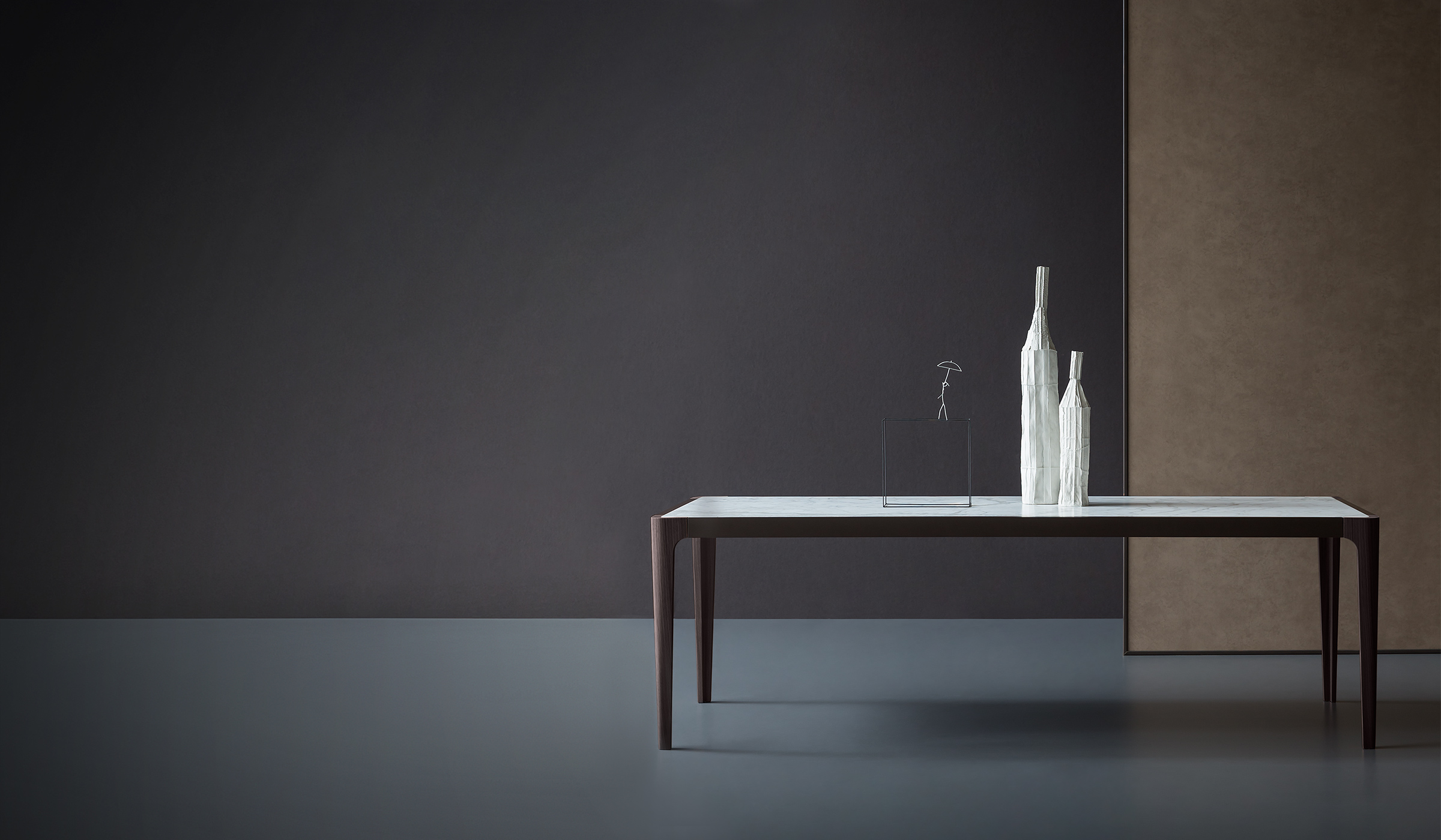 The distinctive traits of this table were inspired by the Rationalist design of the Thirties, revisited with a contemporary twist.