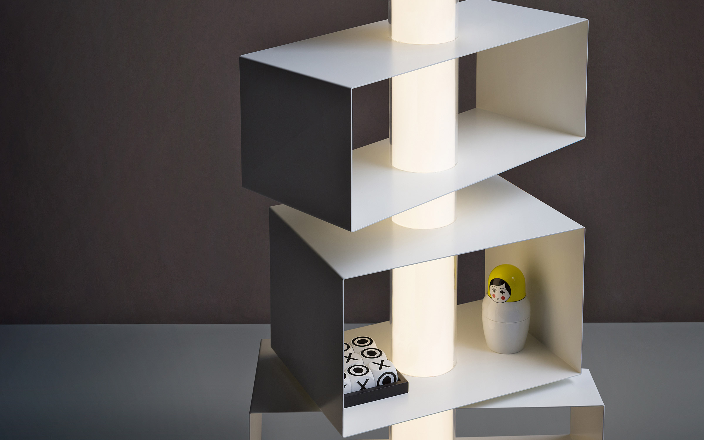 Despite being inspired by ancient totems, this piece of furniture can be used as a bookcase, a display unit and a light source, projecting an undeniably contemporary image.