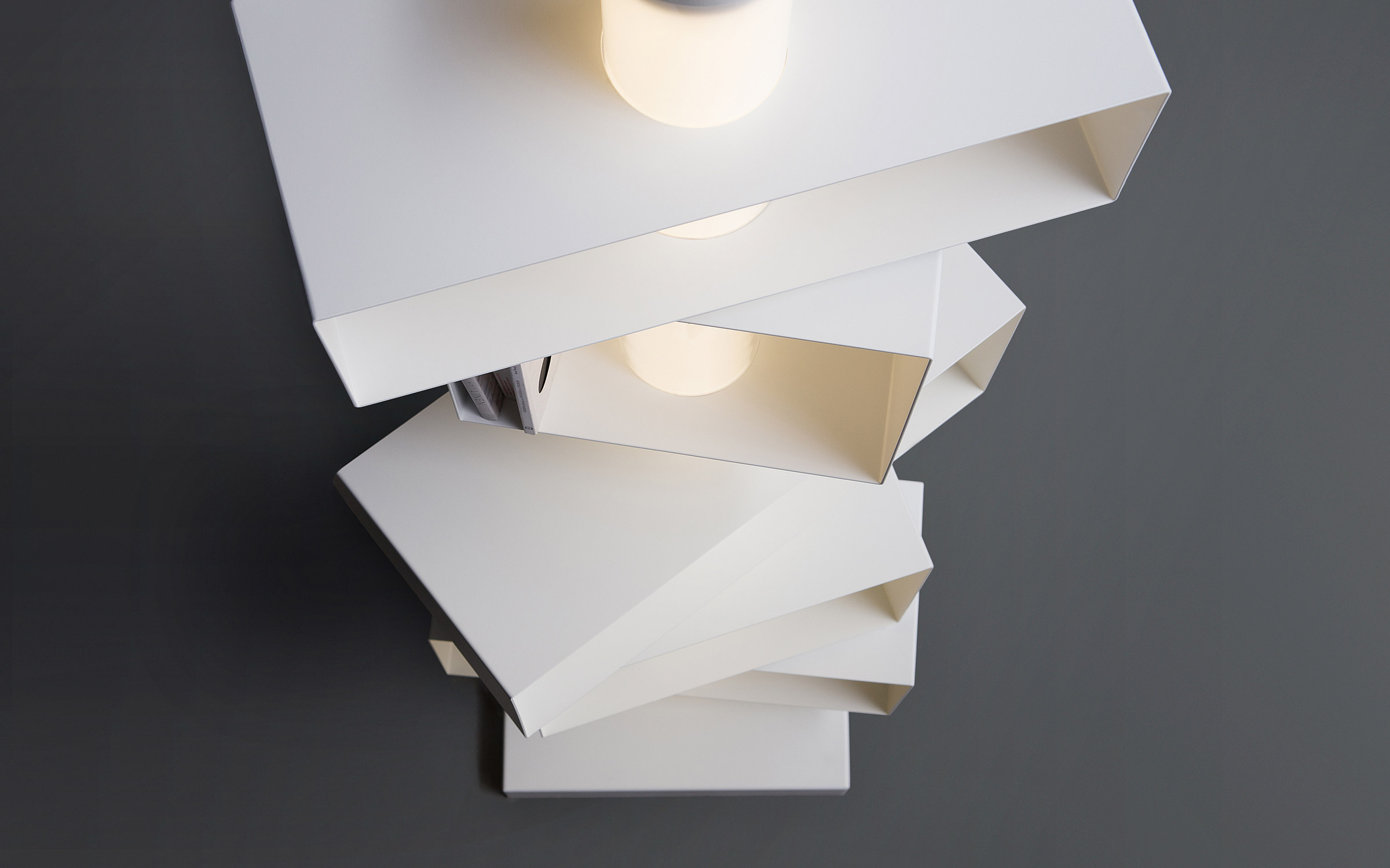 Five swivel containers of different dimensions with integrated LED lights are attached to the central column. Rotating the containers facilitates access to the content and modifies the quantity of light diffused. The arrangement of these containers can be defined during the assembly stages to satisfy the client’s taste and specific requirements.