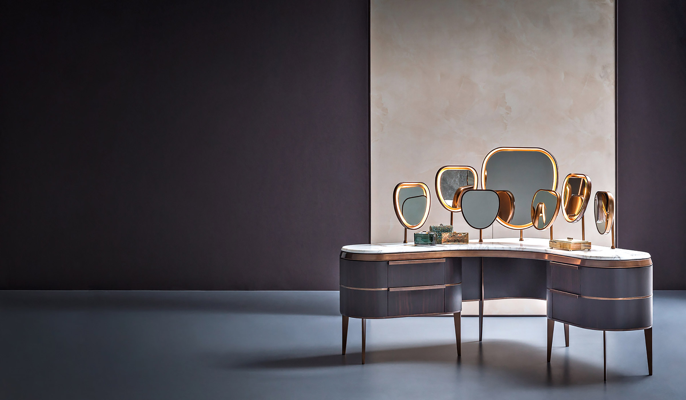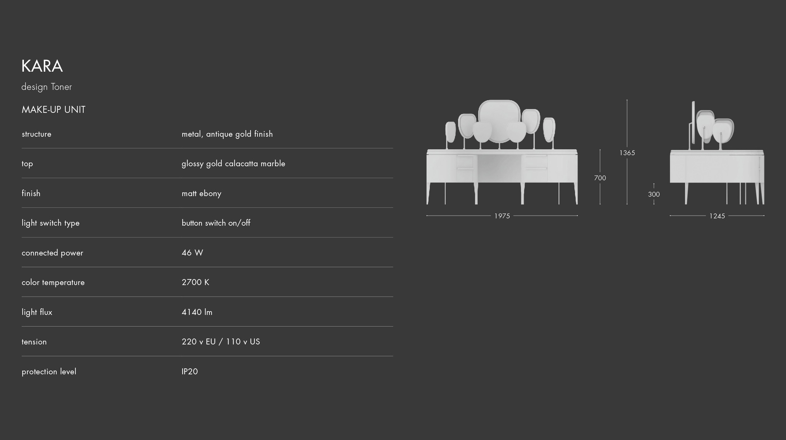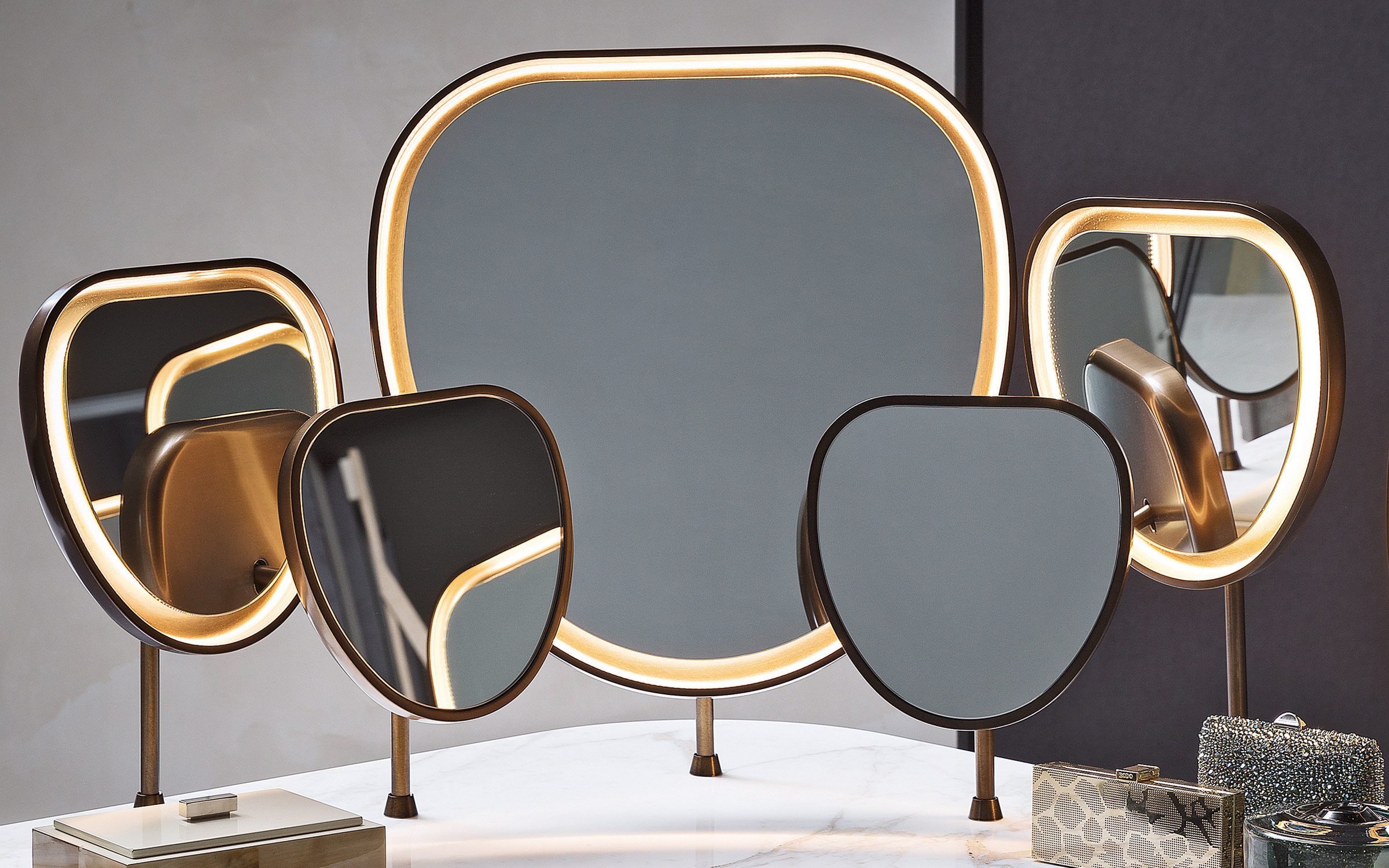 Kara is an elegant make-up desk, complete with four drawers and a sinuous gold Calacatta marble top, surrounded by seven adjustable mirrors with integrated LEDs that emit magical luminosity. An antiqued gold finish for the handles, trim and the mirror supports. The lights are controlled by an on/off switch, a remote control or by Casambi, the exclusive smart-lighting system that controls the illumination from a smartphone or tablet.