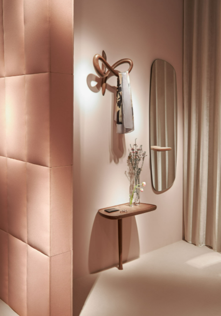 The singularity of this mirror is base don its caring proportions; a hand-made natural walnut shelf combines the softness lines of the mirror.