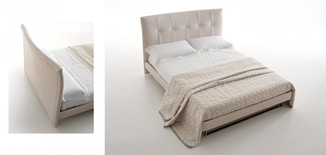Letto Bloom dalle linee nette e pulite, sorprendentemente classico. La testata è ampia e accogliente, impreziosita da una delicata lavorazione a impunture regolari, a formare un moderno capitonné. Un perfetto mix di comfort ed eleganza di altri tempi