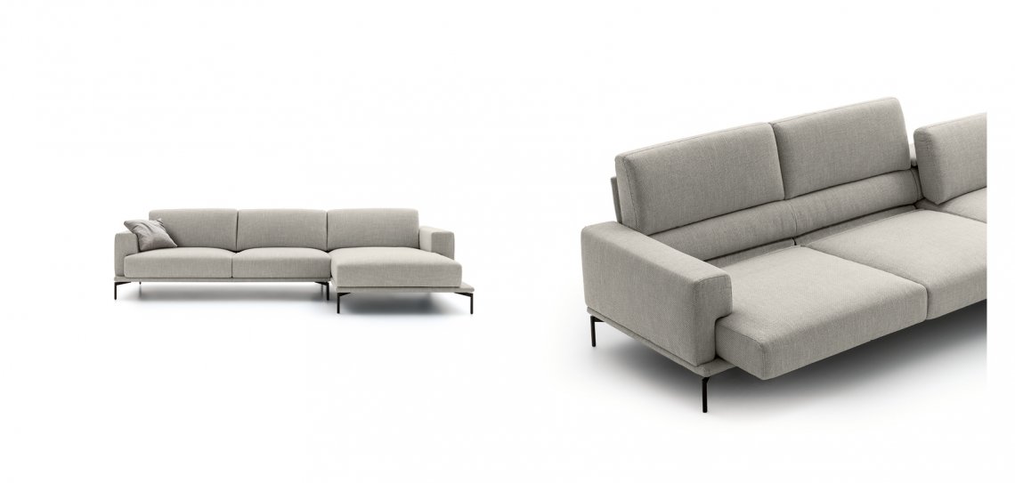Comfort e volumi misurati caratterizzano il divano Airon. Il modello prevede diversi elementi che ne moltiplicano le possibilità di utilizzo. Lo schienale regolabile, per esempio, offre diverse opzioni di seduta: con sostegno più alto, ideale per conversare; comfort, perfetta per leggere; relax, più profonda, per la massima comodità.