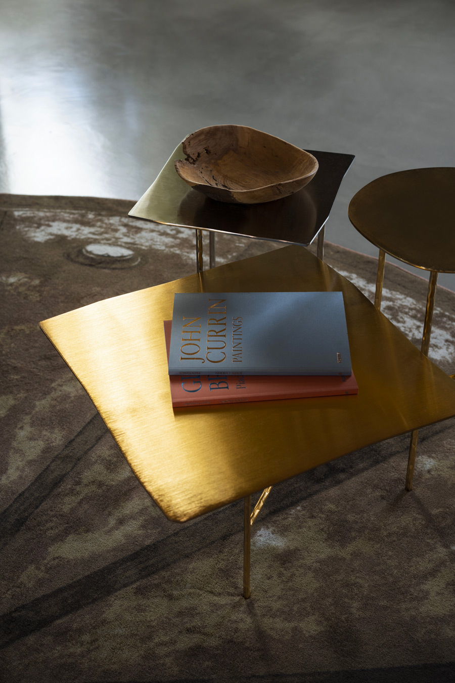 Ciò che salta subito all’occhio nella serie di tavolini da caffè XXX disegnata da Lapo Ciatti è il contrasto tra le finiture preziose e le forme volutamente irregolari, non finite.