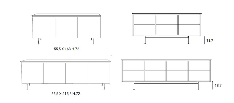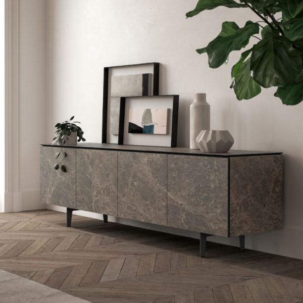Madia disponibile a 3 o 4 ante, fianchi e top in ceramica. Top stratificato con lastre in vetro, ante e fianchi accorpati su struttura in legno. Ripiani interni in cristallo e piedini in metallo verniciato.