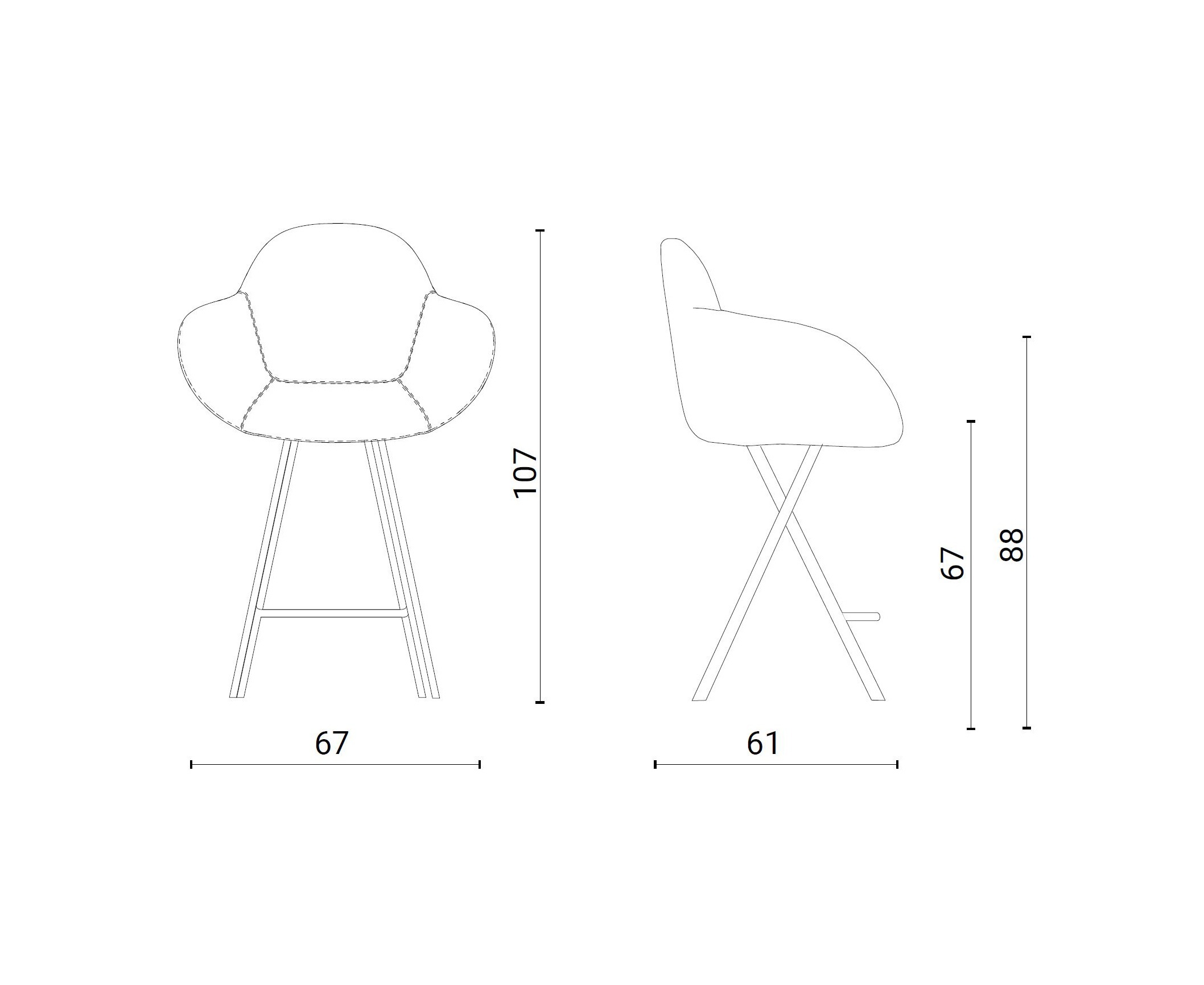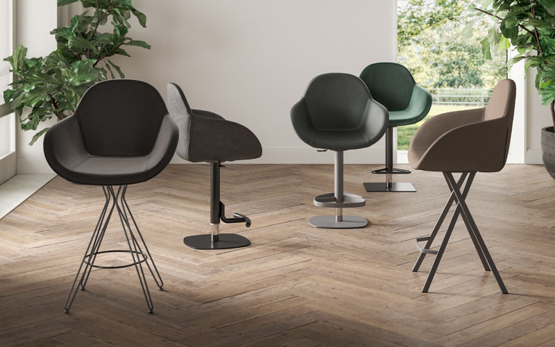 Sgabello fisso con base in metallo e seduta rivestita in pelle, eco pelle nabuk o velvet.