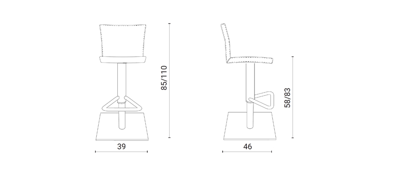 Sgabello con alzata a gas, basamento in metallo e seduta rivestita in pelle o eco pelle nabuk.